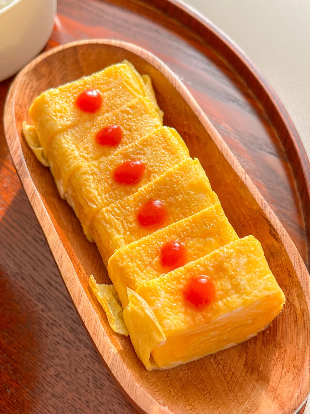 4.鸡蛋卷在锅内把四个面都煎到,出锅切块,沾番茄酱