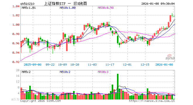1月8日,上证指数ETF(510210)开盘跌0.20%,报1.018元。上证指数ETF(510210)重仓股方面,农业银行开盘跌0.27%,贵州茅台跌0.00%,中国石油跌0.10%,工业富联涨0.25%,恒瑞医药涨1.80%,三一重工跌0.05%,紫金矿业跌1.42%,中国银行涨0.00%,招商银行涨0.12%,邮储银行涨0.18%。