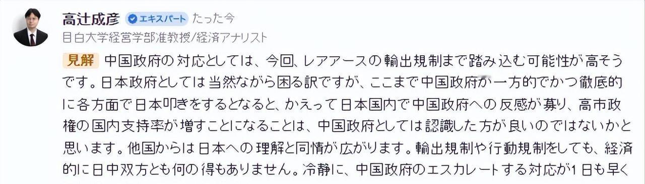 日本见抗议无效,现在开始换套路了。针对中国对出口日本军民两用物项的限制禁令,日本经济专家高辻成彦今天开始“警告”中国了。他说:中国对日本进行限制,当然会造成日本的困扰,但中方如此单方面的打压日本,势必会加剧日本国内对中国的“反感”,进而推高高市早苗的国内支持率。他还强调“中国最好认清这一点”。 高辻成彦作为曾任职于日本经济产业省、如今身兼目白大学教授的所谓专家,其通过日本电视新闻网抛出的言论,本质上是站在日本右翼立场上的片面说教,看似有理有据,实则经不起现实数据与国际规则的推敲。 先看他所谓中方措施会加剧日本民众反感、推高高市早苗支持率的说法,这完全是脱离日本国内实际的自我臆想。 高市早苗的支持率高低本就是日本内政,中方从始至终从未将其作为施策考量,我们唯一关注的,是日方是否尊重中国核心利益、是否干涉中国内政。 事实恰恰相反,高市早苗去年11月在国会公然鼓吹“台湾有事就是日本有事”,暗示要武力介入台海,这种粗暴干涉中国内政的言行,不仅引发中国人民强烈不满,在日本国内也遭遇广泛质疑。 日本共同社去年12月下旬的民调显示,高市内阁支持率已较11月下跌2.4个百分点至67.5%,不支持率上升3.9个百分点至20.4%,其中59.9%的受访者认为其涉台言论会对日本经济造成负面影响,在不支持内阁的受访者中,75.8%的人直指高市“出言不慎”。 这种情况下,所谓“推高支持率”不过是高辻成彦一厢情愿的空想,毕竟日本民众再糊涂,也不会为损害自身利益的政客投出支持票,高辻显然高估了右翼言论的号召力,也低估了日本民众对经济民生的关切。 高辻成彦声称中方举措会让日本获得国际社会同情,这更是打错了算盘,暴露了日方习惯性倒打一耙的伎俩。 中方此次加强对日军民两用物项出口管制,完全是基于《中华人民共和国出口管制法》等法律法规,为维护国家主权安全采取的必要措施,既符合国际法,也契合国际通行惯例,根本不存在所谓“单方面打压”。 所谓军民两用物项,涵盖了从稀土金属、航空发动机材料到碳纤维、高精度计算机等上千种产品技术,商务部2026年发布的管理目录就长达168页,覆盖现代军工产业关键领域。 中方的管制精准打在日本军工的“七寸”上,却绝非无端施压,而是对高市政府突破中日关系政治基础的直接回应。 日本妄图装出受害者姿态博取同情,可国际社会谁都清楚,日本才是破坏双边关系的始作俑者,高市早苗的涉台言论是1945年日本战败以来,现职领导人首次公然鼓吹武力介入台海,严重违反《联合国宪章》宗旨原则。 更何况,日本自身就是出口管制的惯犯,2025年就曾通过限制三种关键原材料出口拿捏韩国,上演过“自伤一百损敌一千”的戏码,如今轮到自己被管制,就哭着喊着要同情,这种双重标准只会让人不齿。 从实际反应来看,国际媒体更多聚焦于管制对日本制造业的冲击,路透社就指出此举将深远影响日本汽车等关键行业,并无所谓“同情日本”的舆论倾向,毕竟在主权安全问题上,各国都有采取必要措施的权利,这是国际社会的基本共识。 至于高辻成彦希望中方主动撤回限制措施的诉求,无疑是痴心妄想,若想打破僵局,主动权从来不在中方手中,而在日方是否愿意回归中日关系政治基础。 中方的管制绝非一时意气用事,而是精准、长效的安全举措,从执行力度来看,不仅禁止所有两用物项向日本军事用户及用途出口,还堵死了第三方转口的可能,明确规定任何组织个人违规转移都将被追究法律责任,这种全方位管控让日本几乎没有规避空间。 日本对中国相关物项的依赖早已深入骨髓,即便这些年拼命寻求进口多元化,其稀土整体进口对华依赖度仍达60%,而用于电动汽车电机、导弹制导系统的镝、铽等重稀土,更是几乎100%依赖中国。 关键的是,中日关系的政治基础是一个中国原则和中日四个政治文件,高市政府不仅违背承诺,还在加速扩军,防卫费实现“十三连增”,五家主要军工企业销售额增速全球第一,人均防卫费是中国的3倍,这种一边挑衅一边求妥协的做法,根本不可能换来中方的退让。 高辻成彦作为经济专家,理应清楚经济合作的前提是政治互信,没有政治基础的经济关系如同空中楼阁,可他却刻意回避日方挑衅的根源,一味要求中方妥协,这种避重就轻的言论,不过是为日本的错误行为找借口。 国际社会早已看透日本的把戏,所谓“同情”“反感”都是日方的自我麻醉,唯有高市政府拿出实际行动,纠正涉台错误言论,重新恪守中日关系政治基础,双边关系才有回到正轨的可能,否则中方的管制措施只会持续生效,日本也只能吞下自己种下的苦果。 毕竟中国从不主动挑起争端,但也绝不畏惧任何挑衅,在主权安全问题上,没有任何妥协退让的空间,这一点,高辻成彦和日本政府最好早点认清,而不是抱着不切实际的幻想对中国指手画脚。