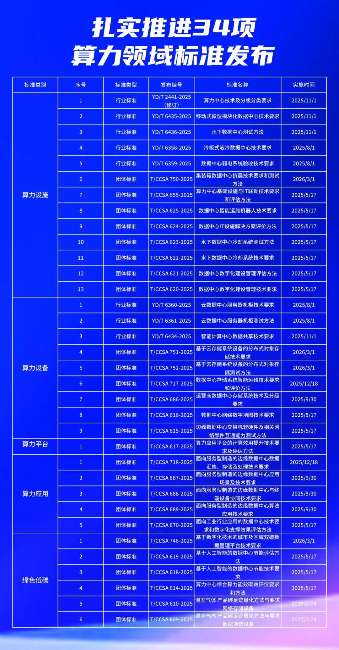 2025年,中国信息通信研究院坚决落实国家关于算力基础设施高质量发展的战略部署,聚焦计算力、存储力、运载力、绿色低碳、智能运营、液冷及融合创新技术等算力产业关键领域,发布标准34项、新立项标准41项、服务企业数十家,用标准赋能产业升级。本文带您回顾年度标准工作成果与2026年计划。