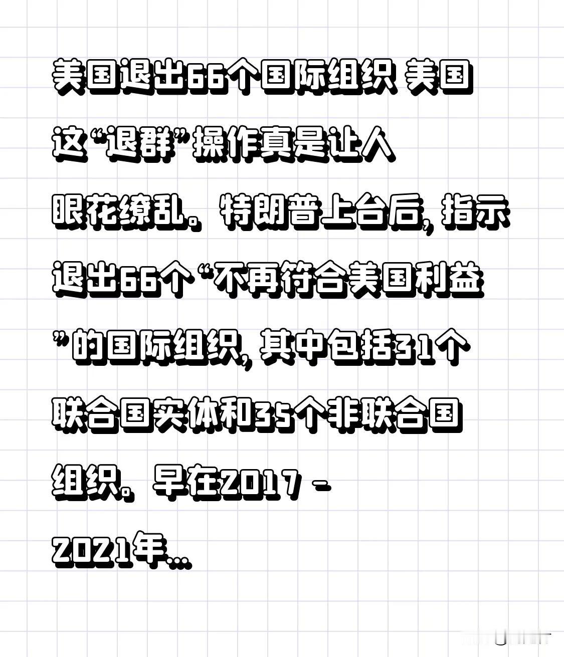 美国退出66个国际组织 美国退出66个国际组织,“退群”操作令人目不暇接。特朗普上台后,指示退出66个“不再符合美国利益”的国际组织,包括31个联合国实体和35个非联合国组织。 早在2017 - 2021年首个任期,美国就退出《巴黎协定》等多个国际组织与多边机制,遭广泛批评。拜登就职后有“重返”之举。然而2025年特朗普上台,重启“退群”,世卫组织、《巴黎协定》等又被美国抛弃。美国如此肆意妄为,只图自身利益,不顾国际责任与合作,世界秩序恐将大乱。 美国体制崩解 美国退群 国际组织的奥秘