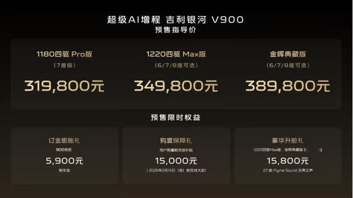 吉利银河V900,严格来说这车就是翼真L380的增程版车型,所以,这车最大的优势已经显而易见:空间优势突出,座椅布局灵活多样。 结合31.98W起的预售价来看,壹哥认为新车还是比较有竞争力的。 首先,和岚图梦想家、魏牌高山9比起来,并不能说银河V900车身尺寸优势明显,但如果比空间,银河V900却完全可以做到“遥遥领先”,原因就在于它空间布局的独特性。你能明显看到,新车前门和前轮拱是融为一体的,所以,它的前排座椅足够靠前,进而保证车内空间更大,甚至装下4排座椅。 不夸张地说,如果你家庭成员足够多,或者说有带娃以及双方父母同时出行的刚需,银河V900是个不错的选择。 再一个,银河V900的定价够到。同样是身材差不多的几款车型对比,银河V900明显是要比岚图梦想家、魏牌高山9、理想mega更便宜,即便现在公布是只是预售价。 且即便价格不高,银河V900却一点没有“偷工减料”,最低配的PRO版车型,纯电续航220km(CLTC),四轮驱动,百公里加速6.5s,千里浩瀚H5上车,城区领航辅助也有,三排座椅全部电动调节…… 当然,壹哥更推荐中配的MAX车型,在和其他竞品入门车型价格相差无几的前提下,该车已经把冰箱、彩电、大沙发都给到满配水平,把续航增加到260km(CLTC),甚至无线超充都给到了4个,可以说,MAX版是找不到缺点的那种。 银河V900就没有缺点吗?也不是,毕竟整体尺寸偏大,有时候这是优势,但有时候也是劣势,就比如这很考验用户的驾驶技术以及停车环境。 (原创/树一)