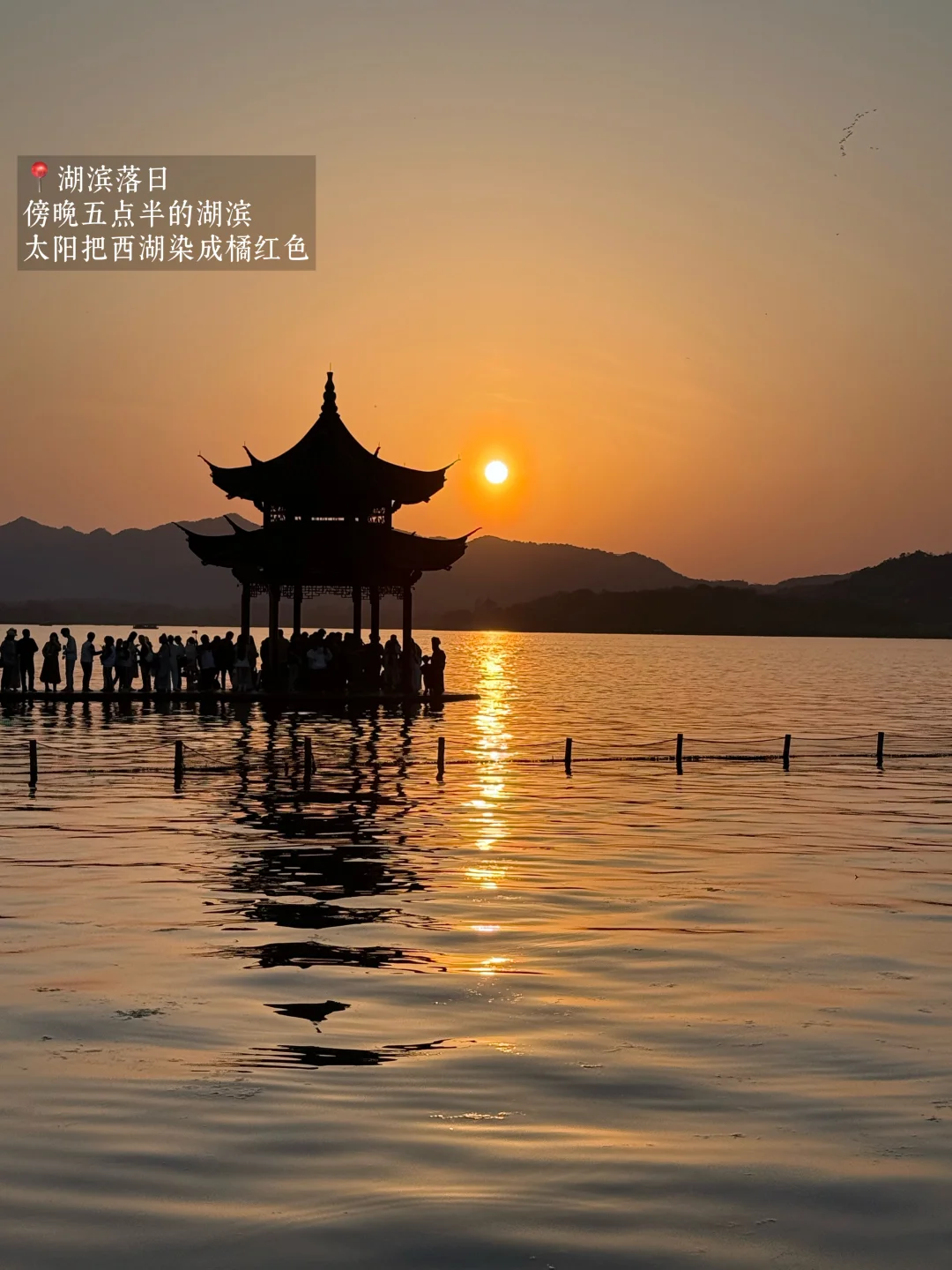 傍晚五点半的湖滨。太阳把西湖染成橘红色,雷峰塔的影子映在水里,游船划过,搅碎一湖金光。