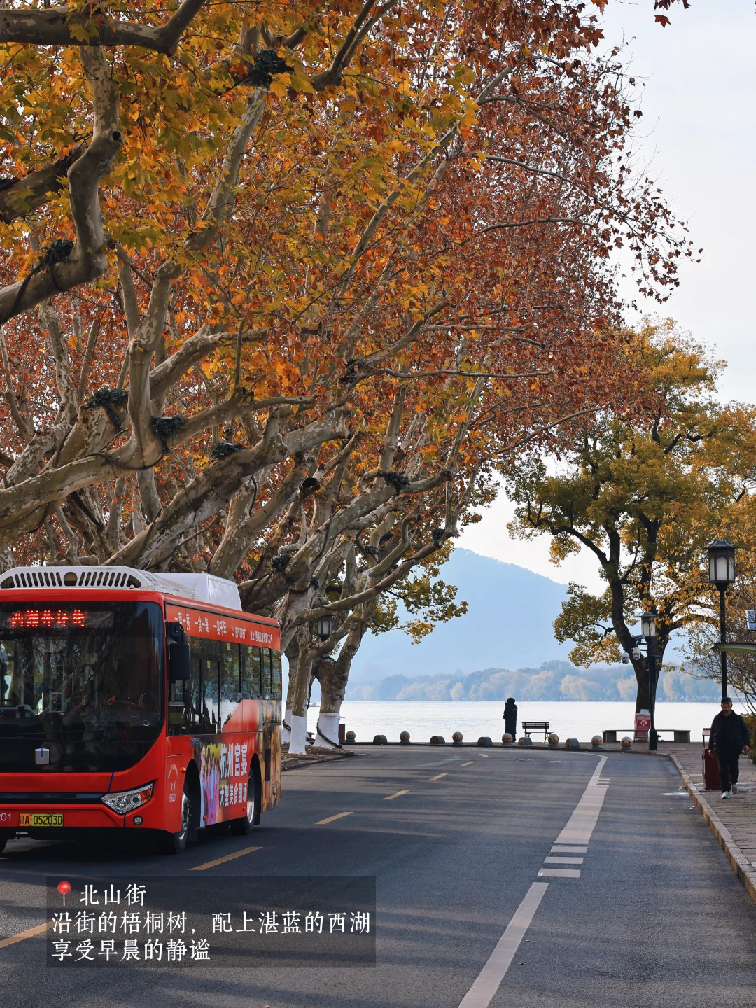 沿街的梧桐树,配上湛蓝的西湖,真的超美。来得早的话,坐在长椅上吹着晨风,享受久违的宁静。