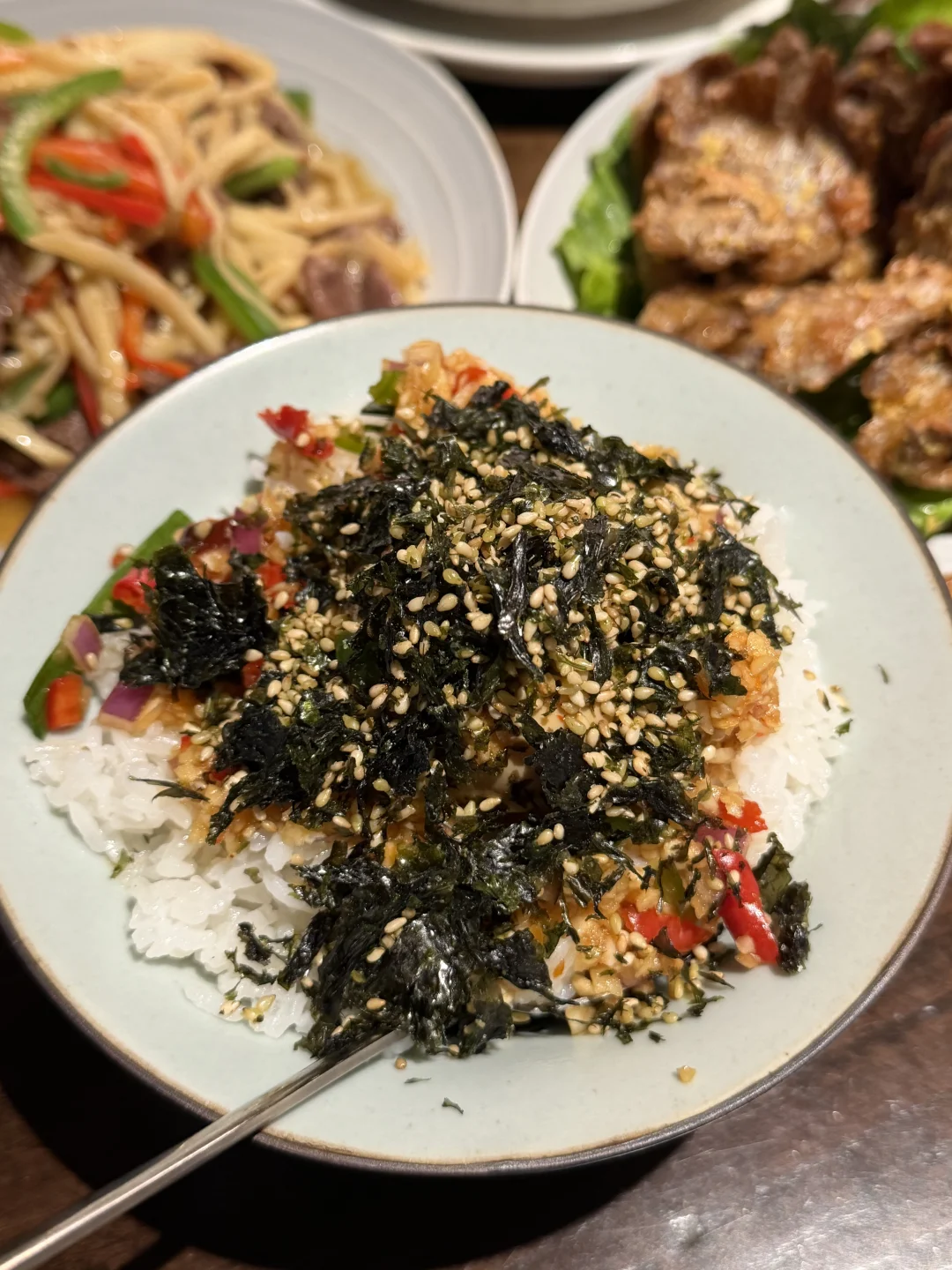 这个是我的最爱,空心菜切的碎碎的和肉沫炒在一起,当之无愧的下饭菜了,一个人可以吃光一盘