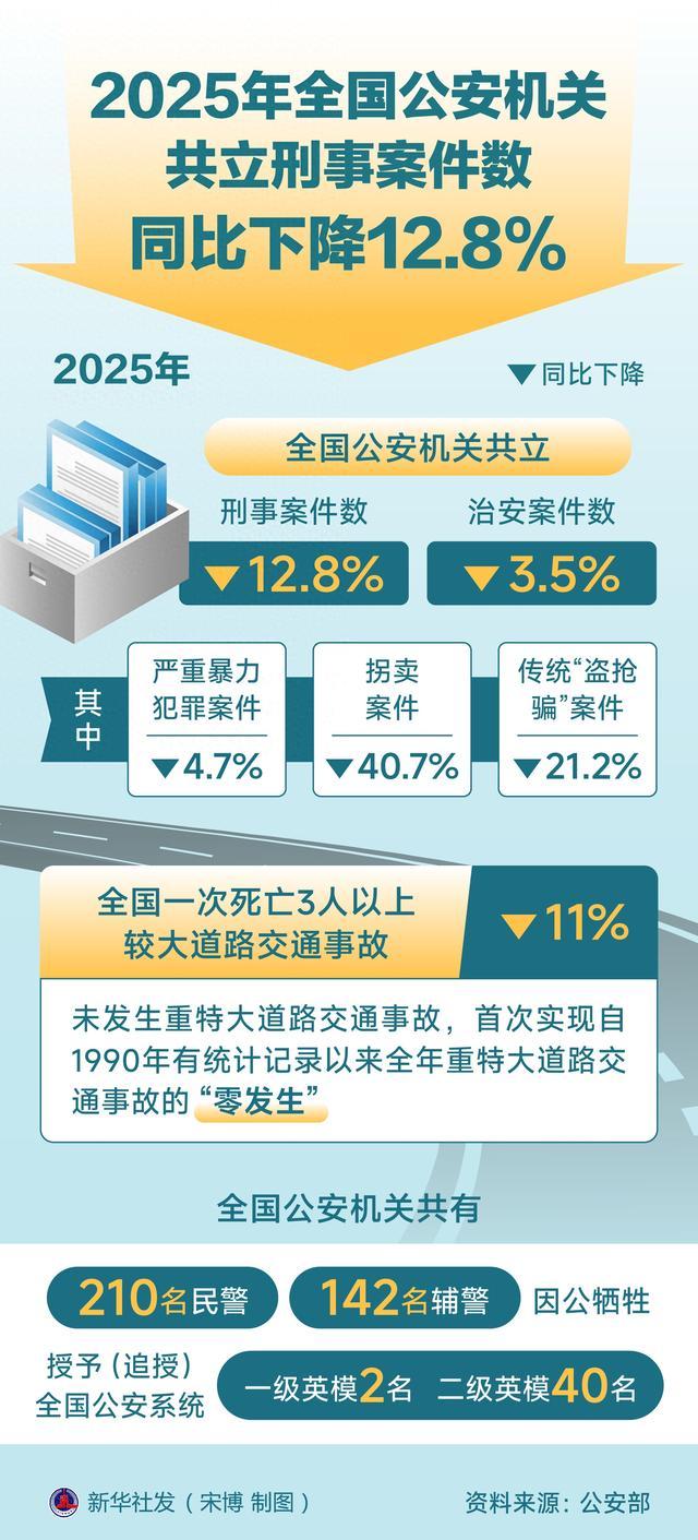 记者1月8日从公安部新闻发布会获悉,2025年,全国公安机关共立刑事案件数同比下降12.8%,立治安案件数同比下降3.5%。其中,严重暴力犯罪、拐卖、传统“盗抢骗”案件分别同比下降4.7%、40.7%、21.2%。