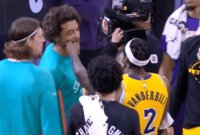 比赛结束后,湖人球员贾里德-范德比尔特与马刺球员杰里米-索汉在场上面对面对喷垃圾话,之后范德比尔特还伸手戳了索汉脸部一下。