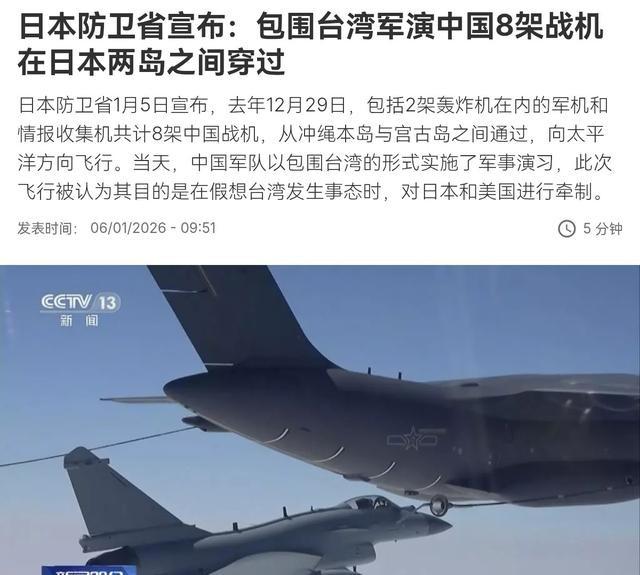日本时隔这么多天才出来吭声!要不是日本防卫省自己说出来,我们都不知道围台军演时,我们轰炸机挂弹对日本进行了震慑!1月6日,根据法新社报道,法媒表示,日本防卫省披露了有关我们对台军演的信息。日本防卫省表示,去年12月29日,包括2架轰炸机在内的军机和情报收集机共计8架中国战机,从冲绳本岛与宫古岛之间通过,向太平洋方向飞行。 中国人民解放军东部战区于2025年12月29日启动正义使命-2025联合演习,覆盖台湾海峡及台岛周边五大区域。这次演习涉及陆军、海军、空军和火箭军等多兵种协同。海军舰艇包括宝鸡舰、衢州舰和太原舰等,开展主炮射击和防空反导科目。 海南舰编队航行超过1万海里,抵达台岛东南海域,与空中力量联动。空军从多个基地起飞歼击机、轰炸机和无人机,执行对海突击和制空任务。火箭军部队进行广域机动,模拟火力覆盖。演习区距台岛最近仅12海里,所有部队携带实弹,检验联合作战能力。东部战区发言人施毅表示,此举针对台独势力和外部干涉,是正当防御措施。 在演习同期,8架中国军机从东海进入,包括2架H-6轰炸机、2架J-16战斗机、2架Y-9情报收集机及2架其他战斗机。这些飞机通过冲绳本岛与宫古岛间的宫古海峡,向太平洋飞行,随后返回东海。H-6轰炸机挂载导弹,显示远程打击潜力。同时,3艘海军护卫舰通过同一海域。日本自卫队从远处监视,无法接近演习区。日本防卫省于2026年1月5日通过网站公布此信息,详细列出机型和路径。这次延迟超过一周,与以往及时报告中国军机动态的惯例不同。 高市早苗上台后,在涉台问题上多次表态。2025年11月,她在国会表示台湾危机可能构成日本生存威胁,引发中方强烈反应。中国外交部要求她收回言论,并实施经济反制,如限制对日出口双重用途物品。12月,她继续强调美日同盟在台海的作用,导致中日关系紧张。北京发出旅行警告,影响日本旅游业。日本经济界担忧供应链中断,许多企业依赖中国市场。高市早苗的立场源于自民党内保守派支持,但也面临国内反对声音。 演习启动后,日本政府最初保持沉默,仅通过外务省发表简短声明关注台海局势。高市早苗未公开评论,避免直接卷入。12月29日当天,日本私下向中方表达关切,提出希望通过对话解决。消息在演习第三天经媒体泄露,日本共同社报道政府有意低调处理。日本加入澳大利亚、英国、法国和德国,共同表达对台海紧张的担忧,但未采取强硬措施。美国总统特朗普表示中美关系良好,不必担心台海问题,这影响了日本的态度。 日本媒体如朝日新闻和产经新闻报道高市早苗先前言论,指出演习针对她的涉台表态。这些文章分析中日紧张升级,强调经济影响。右翼团体减少公开活动,民众组织抗议,反对战争并要求收回言论。抗议活动在东京街头举行,参与者表达对经济衰退的担心。日本经济依赖台湾海峡航道,演习持续可能中断能源进口。高市早苗面临议会质询,坚持立场但未进一步激化。 根据法新社2026年1月6日报道,日本防卫省披露了演习期间中国军机活动细节。这份报告确认了8架军机的路径和类型,强调通过宫古海峡的行动。中国国防部回应称,这是正常训练,不针对任何国家。日本以往习惯及时公布此类信息,此次延迟引发猜测。分析认为,日本避免刺激中方,以防擦枪走火。高市早苗政府选择低调,反映出对军演规模的谨慎。 中日关系在2025年因台湾问题恶化。中国实施多项反制,包括禁止军民两用货物出口日本,影响日本国防产业。北京重申一个中国原则,要求日本遵守1972年联合公报。高市早苗的言论被视为挑战底线,导致外交僵局。日本企业呼吁政府缓和关系,避免贸易战。特朗普的中美友好表态,让日本难以借力施压。 演习展示了中国人民解放军的多域作战能力。海军舰队封控要域,空军无人机接近台北地标,火箭军模拟精确打击。这次演习是2025年第二次大规模围台行动,旨在威慑外部势力。日本西南诸岛靠近台岛,军演路径直接涉及其防区。日本自卫队进行兵棋推演,结果显示难以应对全面冲突。