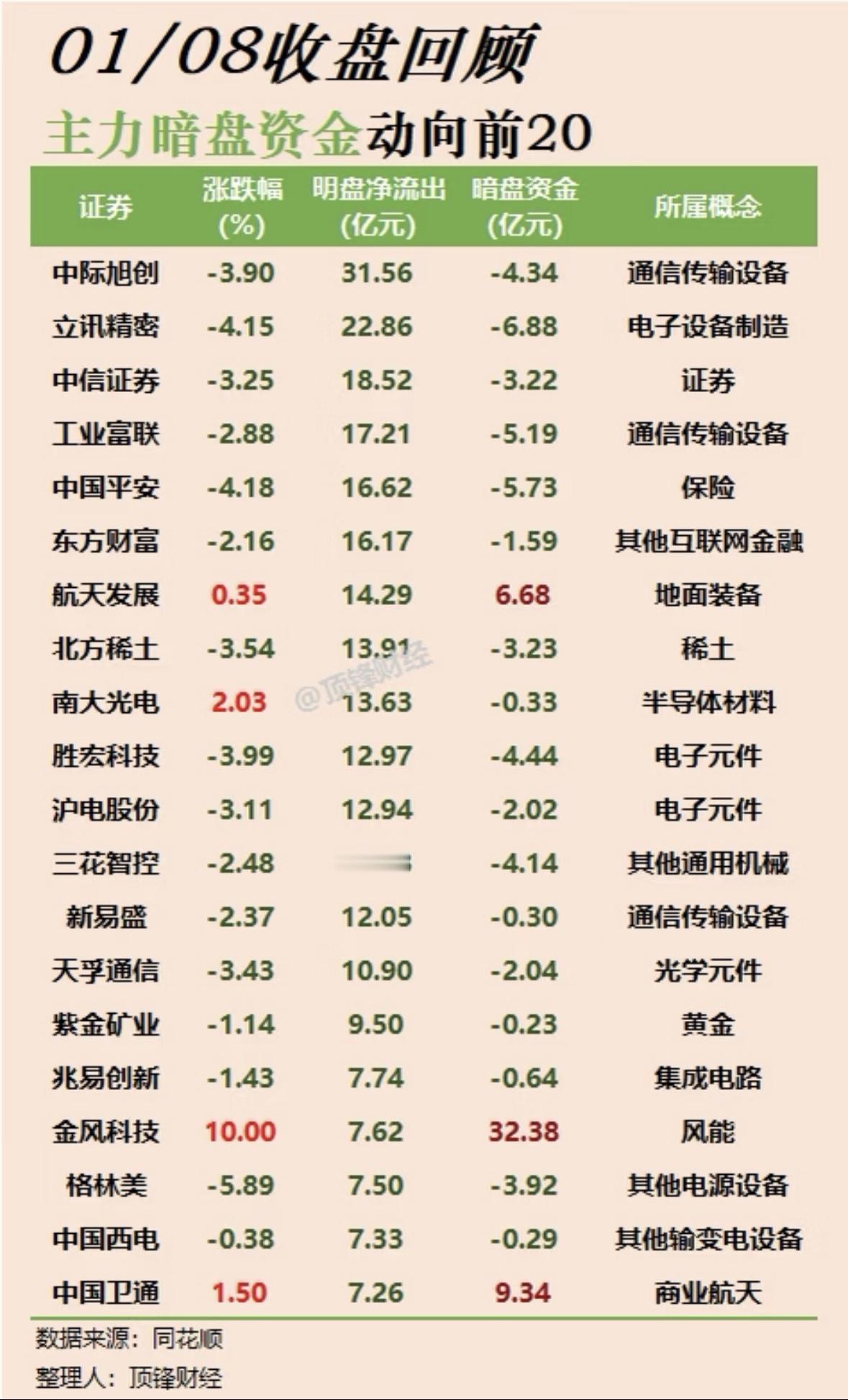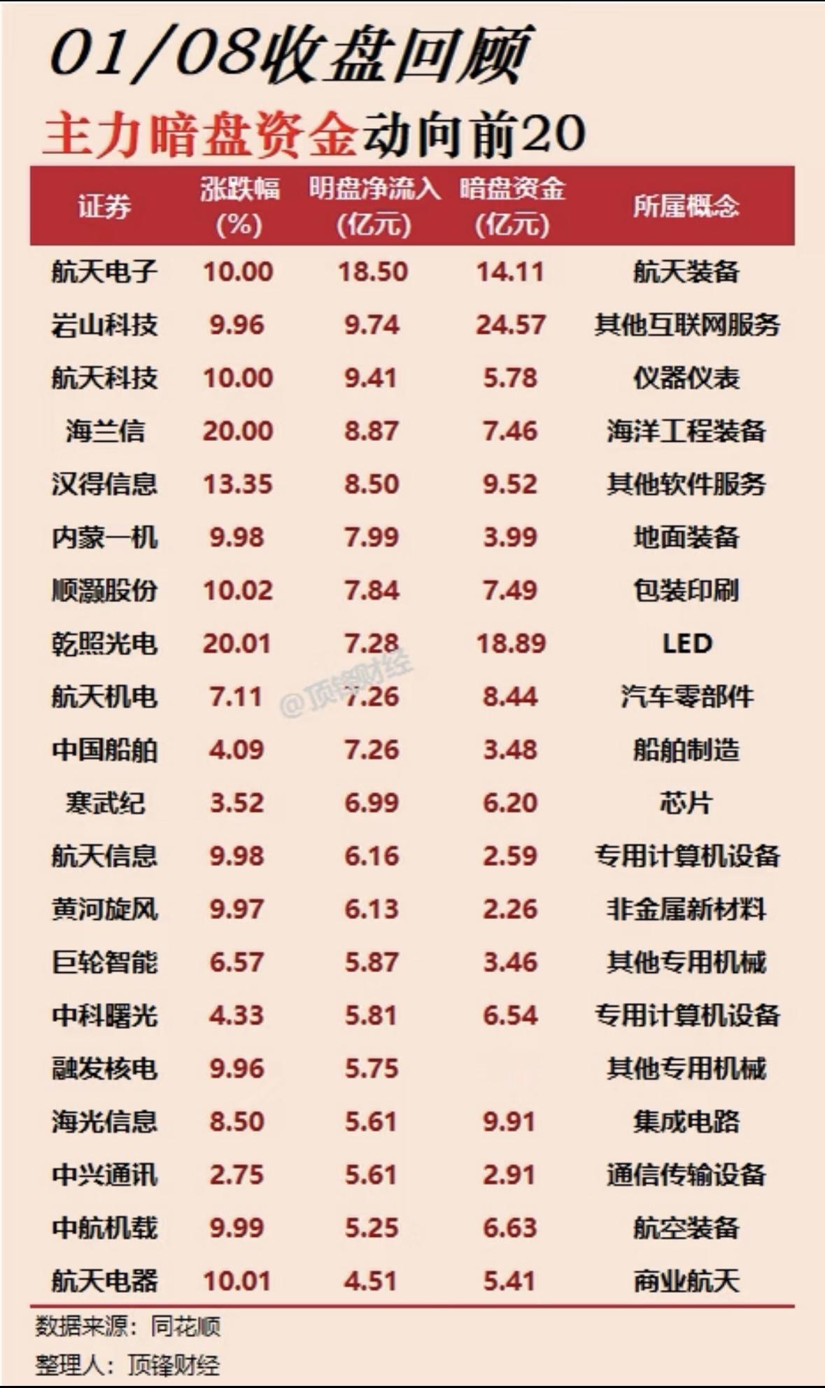 2026年1月8日主力暗盘资金动向前20名股票分析 航天军工领涨,科技股资金活