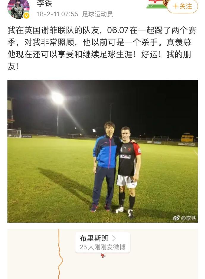 赛后李铁曾在个人社交媒体晒出两人合照,并配文回忆往昔。