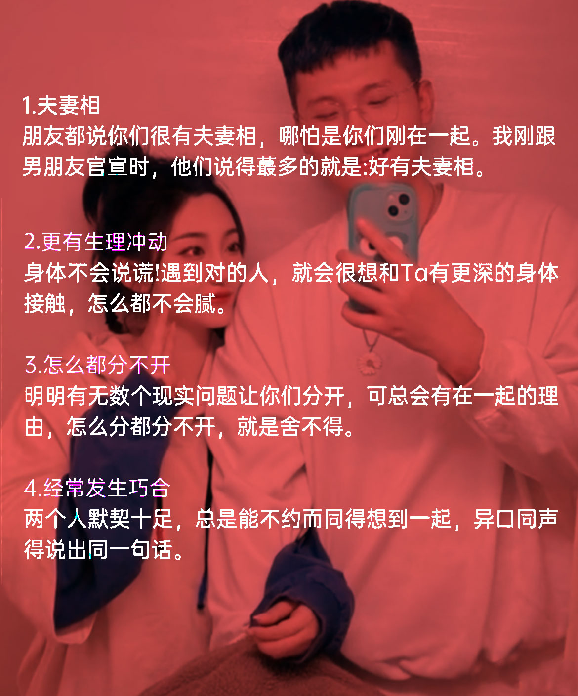 都说缘分是冥冥之中的注定,真正缘分深的两个人,从来不是刻意强求来的,而是自带“同频磁场”,相处时总有藏不住的痕迹。如果两个人之间出现这些征兆,说明你们的缘分早已刻在骨子里~ 1、夫妻相:相处越久,神态、动作甚至眉眼间的感觉都越来越像,不是刻意模仿,而是灵魂同频的自然共鸣,自带“默契滤镜”。 2、有生理冲动:这里的冲动无关欲望,是本能的亲近渴望,比如忍不住想靠近、想牵手、想拥抱,是身体先于理智感受到的灵魂吸引。 3、怎么都分不开:就算有争吵、有误会,甚至短暂分开过,最后还是会因为各种原因重新走到一起。仿佛有一根无形的线,牢牢牵着彼此。 4、经常发生巧合:比如不约而同想给对方发消息、逛街时偶然偶遇、提到某件事对方刚好也在想,这些“心有灵犀”的巧合,都是缘分的信号。 5、莫名的笃定感:刚认识不久,就觉得对方很熟悉,像认识了很久的故人。哪怕未来充满未知,也莫名相信这个人会陪自己走很久。 6、忍不住靠近:不管在什么场合,目光总会不自觉地追随对方;就算在人群中,也会下意识地向彼此的方向靠拢,这是磁场相吸的本能。 7、很信任对方:不用刻意解释,也不用反复确认,就能毫无保留地相信对方。哪怕全世界都质疑,你也会坚定地站在TA这边。 8、人生变得越来越好:和对方在一起后,你们互相鼓励、彼此成就,都变成了更自律、更温柔、更优秀的人,这就是“对的人”带来的正向能量。 缘分最珍贵的地方,就是不费力的契合。遇见这样的人不容易,如果有幸碰到,一定要好好珍惜。毕竟,不是所有人都能在茫茫人海中,找到那个与自己同频共振的灵魂伴侣~ 你和身边的TA占了几个征兆呢?评论区聊聊