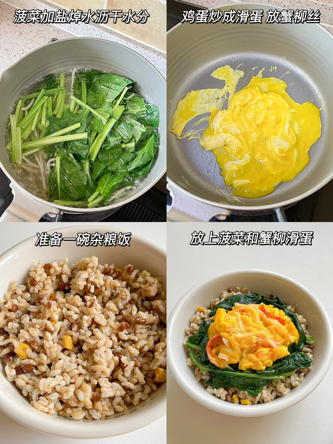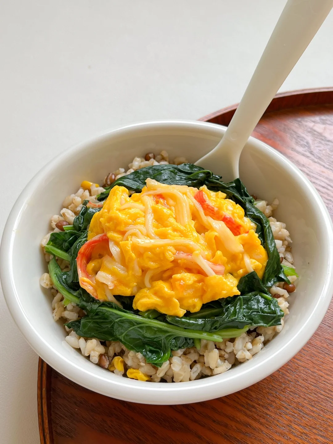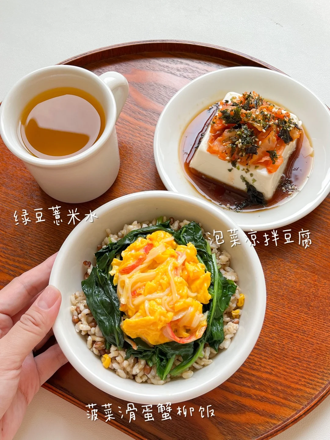 “夏天饮食应该尽量清淡,适量清理脾胃堆积,可以选择吃祛暑祛湿、健脾类的食物,像西瓜、绿豆、薏米这些。” 今日午餐: ¹滑蛋菠菜蟹柳饭 ²辣白菜凉拌豆腐 ³绿豆薏米水