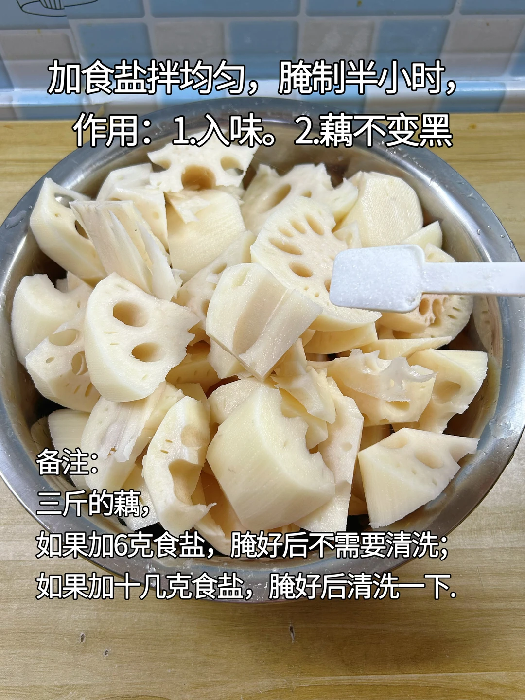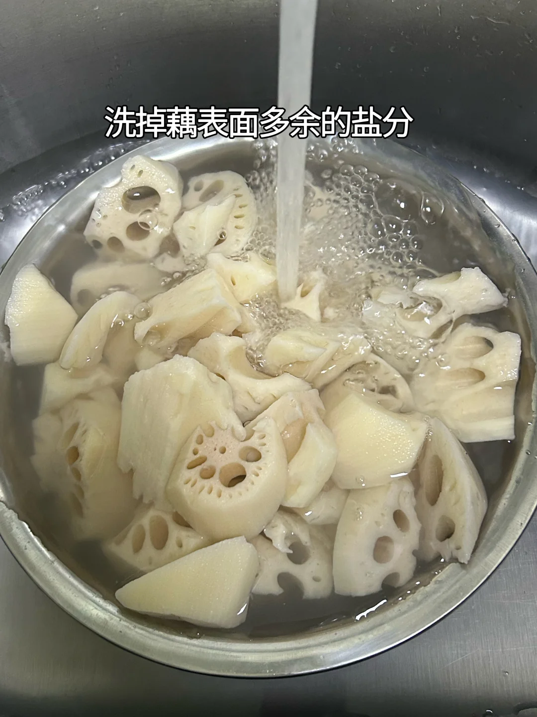为什么你的莲藕炖不烂,炖多久都是脆脆的,一点不粉糯?三个细节告诉你原因,学会了过年做给家人尝尝湖北的特色美食。 主要食材:莲藕(粉藕),排骨 主要调味料:食盐,胡椒粉 步骤: 1.莲藕要选淡黄色带麻点的,不要选很白的。藕节短而粗比细长更粉。切开有白色淀粉渗出在砧板上,说明是粉藕。如果选错品种,选的是脆藕,怎么炖都不烂。(细节一,选藕) 2.藕洗净去皮,切成滚刀块。加食盐两勺(约12克),拌均匀,腌制30分钟。(细节二,用食盐腌制藕) 3.例如藕是三斤,如果加的食盐比较多,比喻十几克,就用清水洗几遍,如果只加了6克食盐,就不用洗。加食盐作用:(1)藕不发黑。(2)藕有食盐入味,吃起来更好吃更鲜。 4.排骨用冷水泡半小时,多洗几遍。 5.排骨冷水下锅,加葱姜去腥,水开焯水3分钟。撇去浮沫,再捞起来用热水洗一遍。 6.油热加姜片炒香,倒入沥水干净的排骨,翻炒至微焦黄。 7.倒入开水,煮至发白。 8.把藕放在高压锅底部,再倒入排骨,并且加足量开水。(细节三,藕放在排骨下面,而且可以先炖藕一段时间,再放排骨一起炖,藕要炖足时间才能烂) 9.盖上盖子,上汽后炖煮25分钟。 10.气压平衡后,开盖加食盐、胡椒粉,味精可选加。 11.撒入葱花即可出锅。 排骨软烂鲜美,轻松脱骨,肉质不柴。莲藕粉糯,轻轻一夹就碎,清甜鲜香。莲藕可以当主食,吃上一碗,饭都不用吃了。如果想汤汁更浓稠,可以取少量煮熟的藕,用榨汁机搅碎,倒入汤里,汤汁更鲜美,藕香味浓郁。