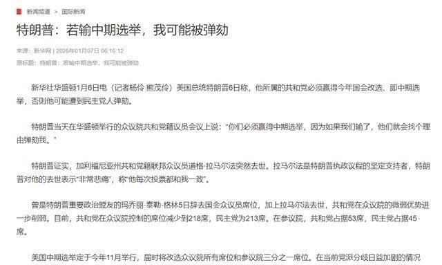 特朗普转性了?还是得高人指点了? 特朗普最近的一句话让不少人摸不着头脑。据新华社1月6日报道,他在华盛顿众议院共和党议员会议上直白喊话,让大家必须赢下中期选举,理由实在得有点反常:“如果我们输了,他们就会找个理由弹劾我。”这和以前那个天不怕地不怕、说话办事全凭性子横冲直撞的特朗普,简直像换了个人,难不成真的转性了,或是背后有高人指点? 要知道,特朗普可不是第一次面对弹劾威胁,之前两度被弹劾时,他都是硬刚到底的姿态。 2019年“电话门”事件,众议院通过弹劾条款,他当众嘲讽对手无力撼动自己;2021年国会山骚乱事件被控“煽动叛乱”,参议院仅一票之差未达定罪门槛,他也始终嘴硬不肯低头。 可这次却主动把“怕被弹劾”摆上台面,连催促议员的语气都带着几分急切,这份反常背后,藏着共和党如今岌岌可危的处境。 他的焦虑不是空穴来风,共和党在众议院的席位优势早已摇摇欲坠。就在发言前一天,曾是他坚定盟友的玛乔丽·泰勒·格林正式辞去国会众议员席位,紧接着加利福尼亚州共和党议员道格·拉马尔法突然去世,这位“每次投票都和我一致”的支持者离世,让特朗普痛心不已的同时,也让共和党在众议院的席位进一步缩水。 目前共和党仅以218席对民主党的213席勉强维持多数,微弱的优势稍不留意就可能翻盘,这也难怪他会急着给议员们敲警钟。 更现实的压力藏在民调数据里,这或许才是他收起锋芒的关键。盖洛普年终民调显示,特朗普的工作支持率仅为36%,勉强高于2021年创下的34%的个人最低纪录。 其中无党派人士支持率只有25%,民主党支持者更是低至3%,仅靠89%的共和党内部支持率撑场面,这样的基础显然经不起中期选举的折腾。他自己也忍不住困惑,“我们推行的政策明明是正确的,公众的想法到底是怎么回事”,这份困惑背后,是对选票流失的深层担忧。 这次发言里,特朗普不仅催着赢选举,还主动给议员们支招,让大家积极宣传移民、关税、医保等政策成果,甚至特意强调要把医保议题从民主党手里抢过来,连税法案里的“惠民政策”都叮嘱要传递给选民。 这份细致和务实,和他以往只靠口号造势的风格截然不同,让人不禁好奇是否有专业团队在背后调整策略。毕竟此前共和党人就抱怨宣传不力,导致选民看不到执政成就,而民主党却能借着民生成本问题在地方选举中屡屡得手。 其实共和党早已在暗中布局,只是局势的严峻程度远超预期。为了巩固席位,特朗普特意要求得克萨斯州重划国会选区地图,试图通过调整选区布局多争取五个众议院席位,最高法院也已批准这份有利于共和党的方案。 可即便如此,民主党也在积极反击,加州民主党人已明确表态要采取措施抵消共和党在得州的优势,两党的选区大战愈演愈烈,每一个席位的争夺都关乎未来的政治走向。 特朗普的处境还不止于国内选举,对外动作的余波也在持续发酵。移民局特工枪杀美国公民的事件,又被民主党抓住大做文章,指责其“血腥镇压平民”。 内忧外患交织之下,他若想在任期后半段顺利推进议程,保住国会控制权就成了必选项,这时候的“服软”更像是一种精准的政治算计。 从硬刚弹劾到主动示弱催票,特朗普的转变到底是认清现实后的务实调整,还是高人指点下的策略升级?他口中的“弹劾风险”是真的迫在眉睫,还是为了凝聚党内力量的话术? 毕竟这位向来不按常理出牌的政客,每一次风格转变都藏着对权力的考量。你觉得特朗普此番表态背后,更多是无奈之举还是精心布局?欢迎留下你的看法。