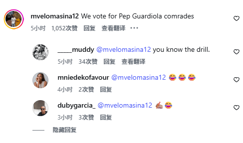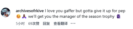 不过在这条动态下面,最高赞的阿森纳球迷评论是“我们投票给瓜迪奥拉”。