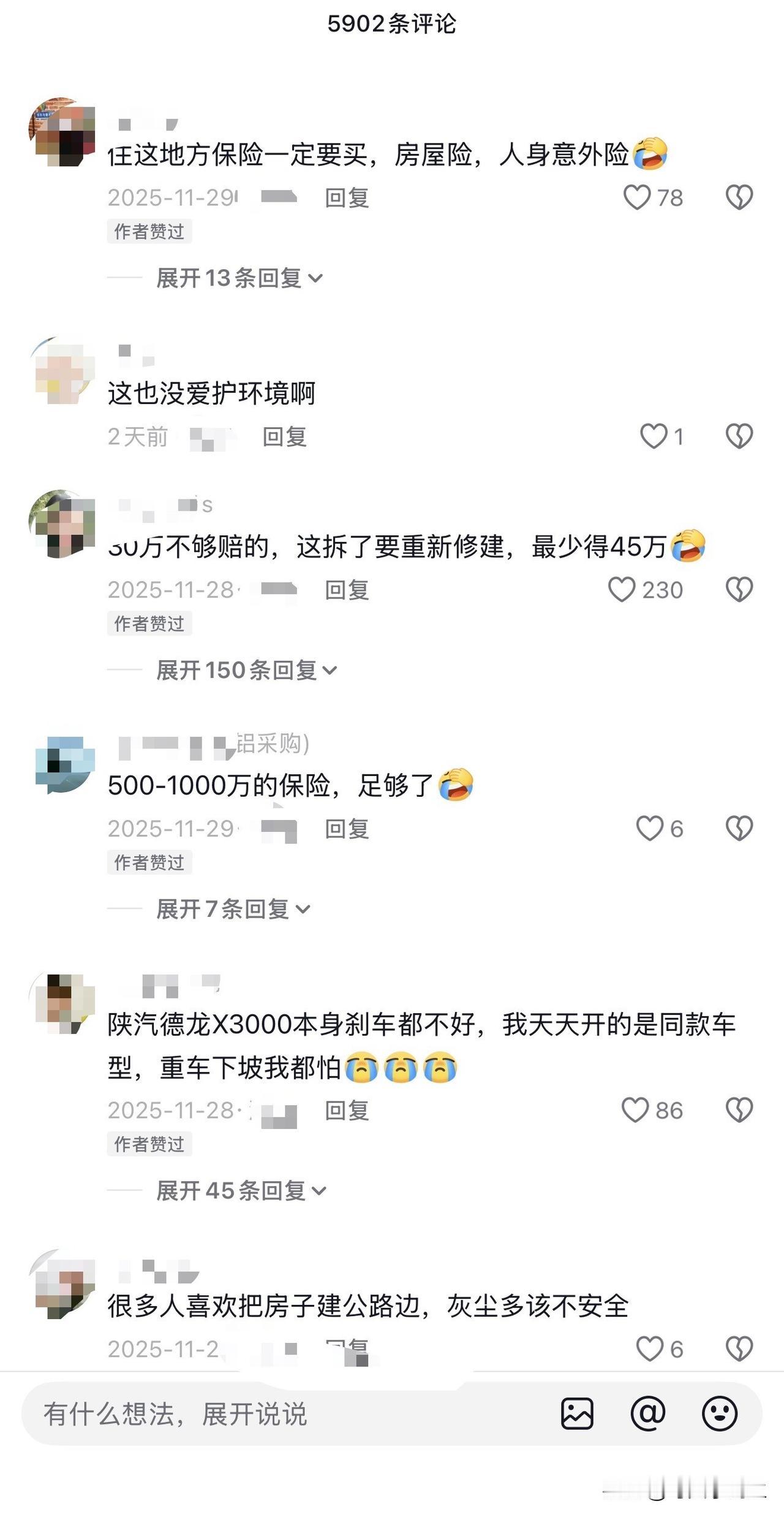 一辆渣土车“钻进”路边民房:房子塌了,最怕的是人出事 刷到一段视频,现场挺震撼:一辆绿色货车冲出路面,半个车头直接顶进路边房子,屋顶塌落、钢筋外露,碎砖碎石堆满屋里,旁边还是高架桥和居民房。 不讨论地点、不猜责任,毕竟只看到视频画面,但这事把几个现实问题一下子砸到脸上。 1,重车事故,赔付往往不是几十万能兜住的,房屋结构受损、清运重建、临时安置、误工……任何一项都可能上量。 2,住在公路边/桥下的风险被很多人低估,车祸冲撞、落石、噪音粉尘都不说了,一旦出事就是硬伤。 3,房屋/财产保险有没有覆盖“第三者车辆冲撞”这类情形;家里常住人有没有基础意外险;门口这种“无缓冲带、无防撞墩”的位置,能不能做物理防护(护栏/防撞墩/退界)。 希望现场人员都平安。你觉得——路边建房,到底是“图方便”,还是“拿命赌概率”?