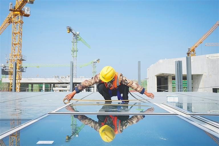 近日,中建二局承建的三亚国际免税城三期项目实现全面封顶。该项目总建筑面积约41.27万平方米,总投资额达70亿元,计划今年起分阶段落成,进一步完善我省免税购物商业布局,丰富旅游消费供给。图为工人在安装天窗。