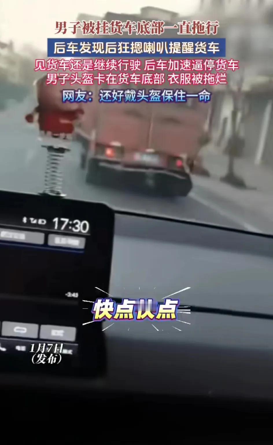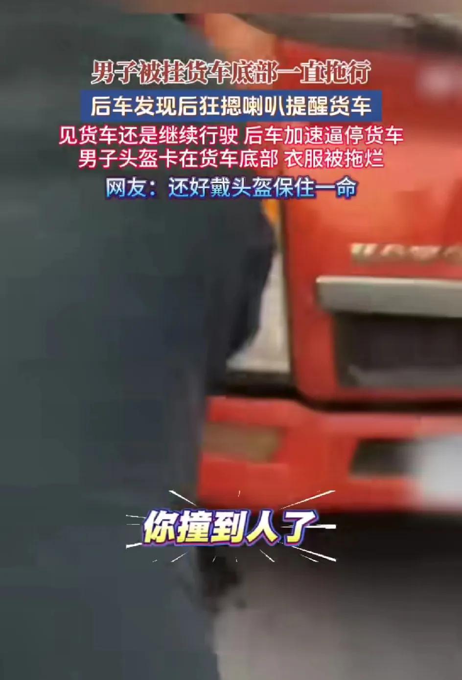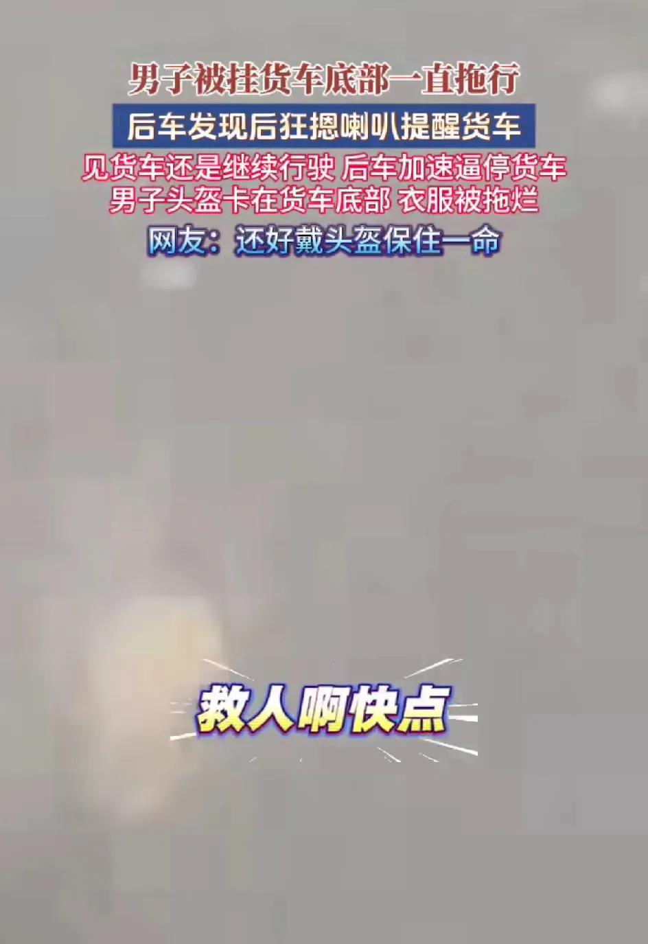 还好戴头盔,保住一命。湖南新邵县发生惊险一幕。一男子被挂货车底部一直拖行。后车发现之后狂按喇叭,加速前行,别停大货车。货车司机竟然一点都不知情。 当事男子头盔被别在货车底部挣脱不了。衣服都被拖烂,幸好是冬天,穿的比较厚。 后车上的三人是救人一命,胜造七级浮屠。