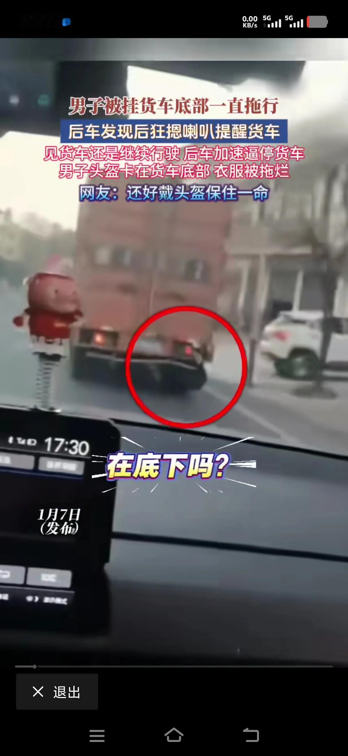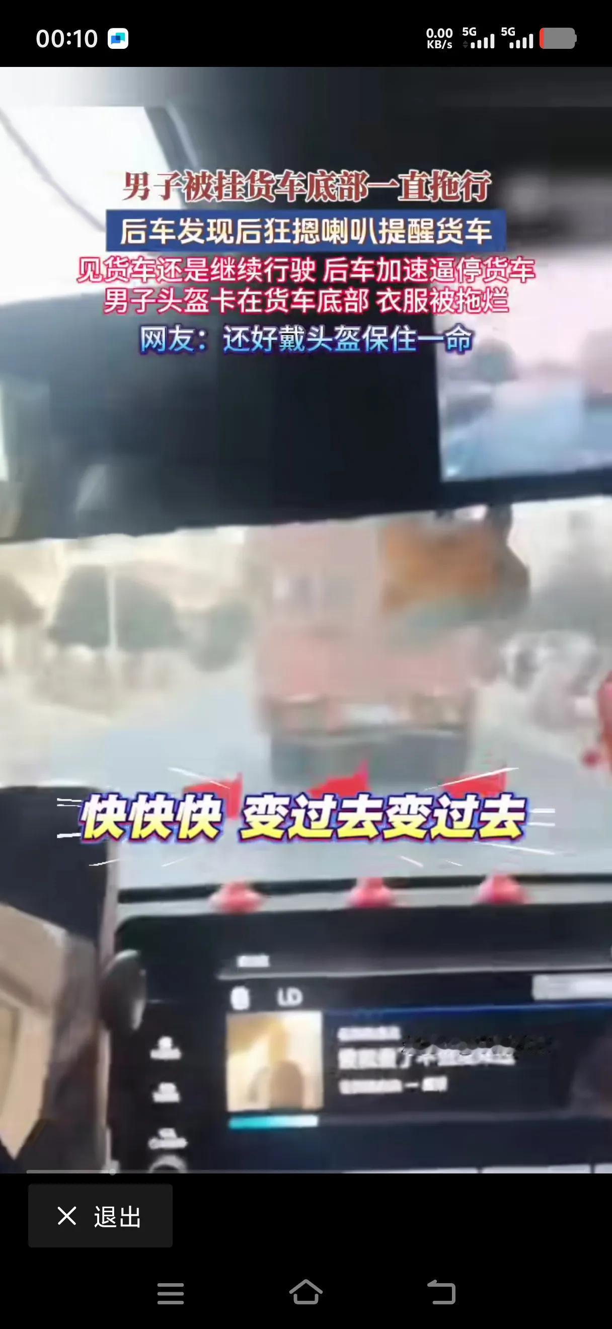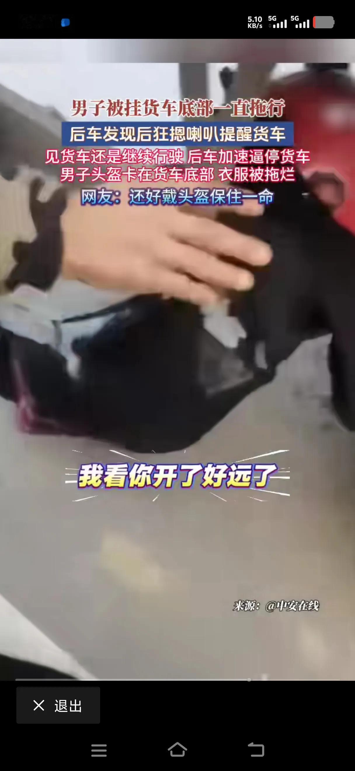还好戴头盔,保住一命。湖南新邵县发生惊险一幕。一男子被挂货车底部一直拖行。后车发现之后狂按喇叭,加速前行,别停大货车。货车司机竟然一点都不知情。 当事男子头盔被别在货车底部挣脱不了。衣服都被拖烂,幸好是冬天,穿的比较厚。 后车上的三人是救人一命,胜造七级浮屠。