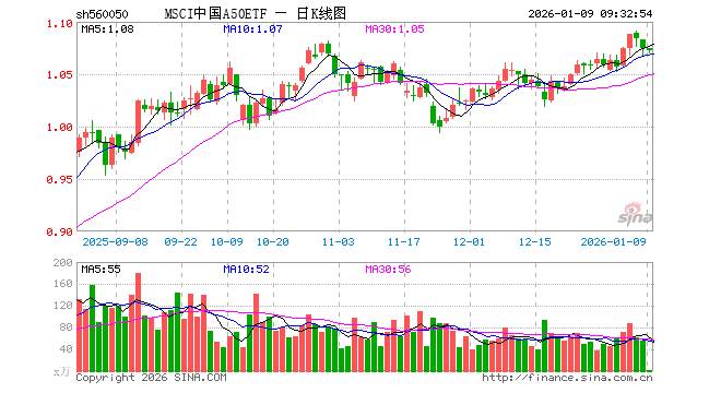 1月9日,MSCI中国A50ETF(560050)开盘涨0.00%,报1.074元。MSCI中国A50ETF(560050)重仓股方面,宁德时代开盘跌0.01%,紫金矿业跌0.83%,工业富联跌1.35%,贵州茅台涨0.33%,海光信息跌1.52%,寒武纪跌1.66%,比亚迪涨0.18%,恒瑞医药跌0.03%,立讯精密跌0.56%,中际旭创跌3.28%。
