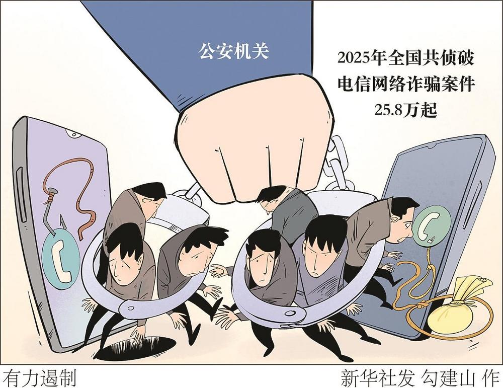 记者1月8日从公安部新闻发布会获悉,2025年,全国公安机关依法严厉打击电信网络诈骗犯罪,有力遏制了犯罪高发势头,共侦破有关案件25.8万起。新华社发勾建山作