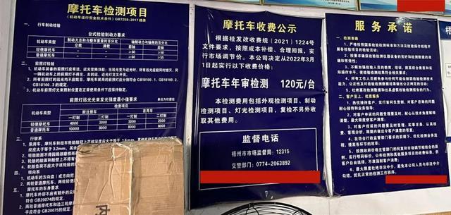 万秀区某家机动车检测机构内张贴的收费公示显示,摩托车年审检测120元/台。张超浩摄