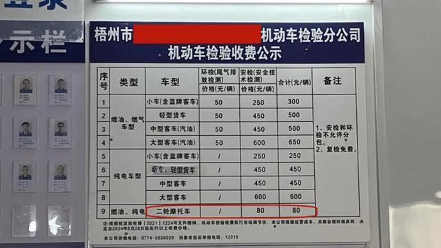 万秀区某家机动车检测机构内张贴的收费公示显示,摩托车安检80元/台。张超浩摄