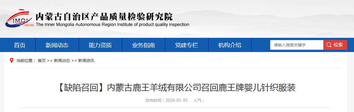 中国质量新闻网讯据内蒙古自治区产品质量检验研究院网站消息,日前,内蒙古鹿王羊绒有限公司按照《消费品召回管理暂行规定》的要求,主动向内蒙古自治区市场监督管理局报告了召回计划,将自即日起,召回2025年4月16日至2025年8月31日期间制造的鹿王V领变化组织婴儿开衫、婴儿裤(规格:90/48),圆领女童装(规格:120/60),变化组织婴儿裤(规格:90/48),涉及数量为72件。