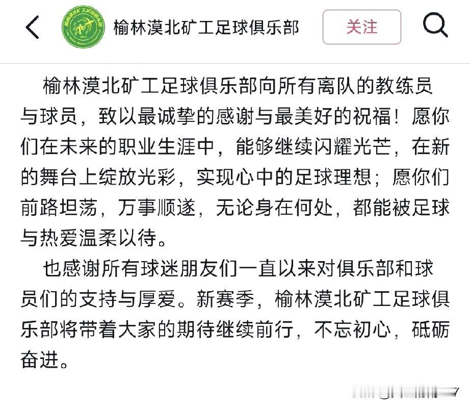 地处陕北的榆林漠北矿工足球俱乐部于今日中午发布公告。 主教练黄宏毅及其教练组,连同去年大部分主力球员均已离队,此消息令人颇为震惊。这相当于把去年的主力阵容和教练组全部换掉,难不成榆林漠北今年不打算冲击乙级联赛了?