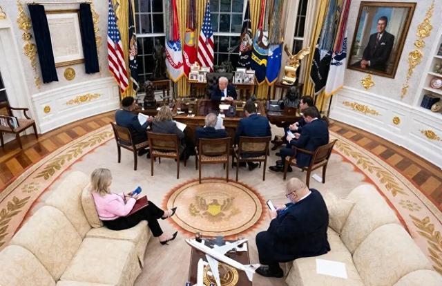 在采访中,特朗普不断切换角色。他不仅对媒体抱怨自己的处境,夸耀自己的成就,还以主人身份殷勤待客:按下按钮召来一名侍从,端来矿泉水和健怡可乐;用激光指示器指向几幅拥有数百年历史的美国总统肖像,向来访者讲解白宫椭圆形办公室的各种更新细节。面对在场的助手和顾问,特朗普又摆出一种父亲般的语气,随口把41岁的副总统万斯和54岁的国务卿鲁比奥等几人称作“孩子们”。这两人脚上穿的鞋,都是他送的礼物。
