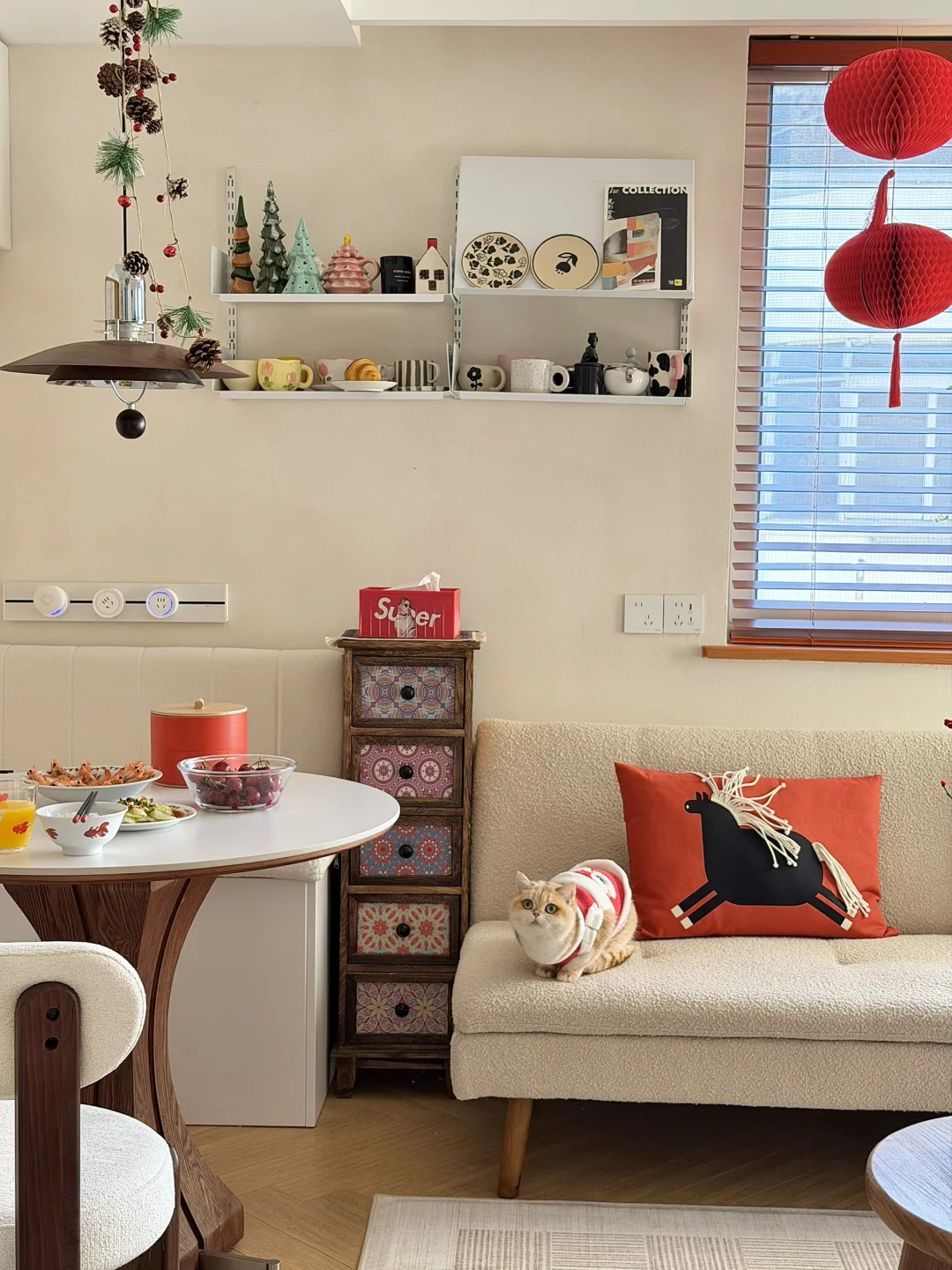 吃完饭回到家就开始新年布置~几十块的红色小马地垫往门口一铺,小猫咪就趴在上面打滚儿,开门就是红红火火的好兆头;二十几块钱的红灯笼挂饰悬在客厅,整个屋子都透着温柔的年味儿;印着小马🐎的新年餐具,瞬间让平淡的餐厅变得喜庆又精致。