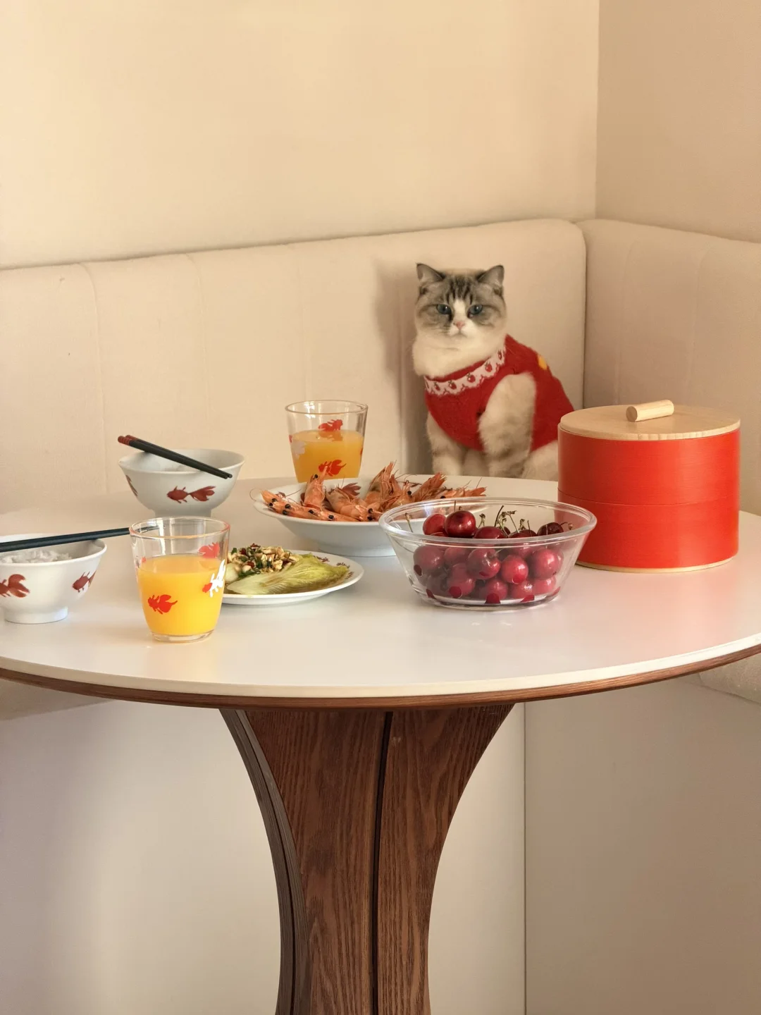 老公用新餐具露了一手,三只小猫好奇的围着我们打转~不用大费周章换家具,这些小物件花小钱就能把年味焊在家里,性价比直接拉满!!