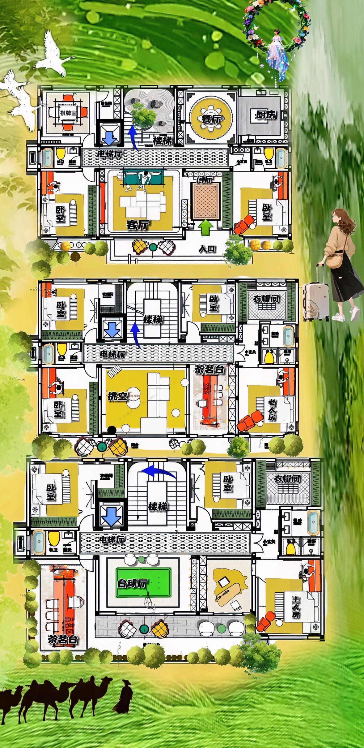 它长了一张朴素的脸,600㎡平凡,每一处都长在居住审美上,栖居,四代同堂杀回了她的统治赛道,九间房,一本正经的自建房,空间很幽默,布局有灵魂! 没见过野墅,不整花园,不弄菜地,不挖瑜伽室,而是一门心思,扩建卧室,为睡觉舒服,多打卧室不回头 ! 九个卧室,是执念,我画过千尺大宅,撑死也就七间房,九间屋虽不是麻烦,住满人,也是纯粹给爱, 发电的好主意! 幸亏房东,家里十二口人,要不然再有魅力户型,也是无趣的灵魂。 灵魂,少的可怜! 一楼没有,非要桃选一个,5.6米挑空勉强算一桩! 二楼茶台,留给长辈房! 三楼台球厅,赐给一亩地大房子,最有冲击力的格局,鲜活布局为三层楼的烟火埋下伏笔! 我就想,顶楼最受青睐的地方,娱乐和休息,格局融合十分巧妙! 怎么形容,头顶吃饭是需求,中层煮茶是意境,下头才是提着台球找乐趣! 布局不一样,动线回归实用,一面颜值在线,一面收纳烟火,又美又能装的自建房!