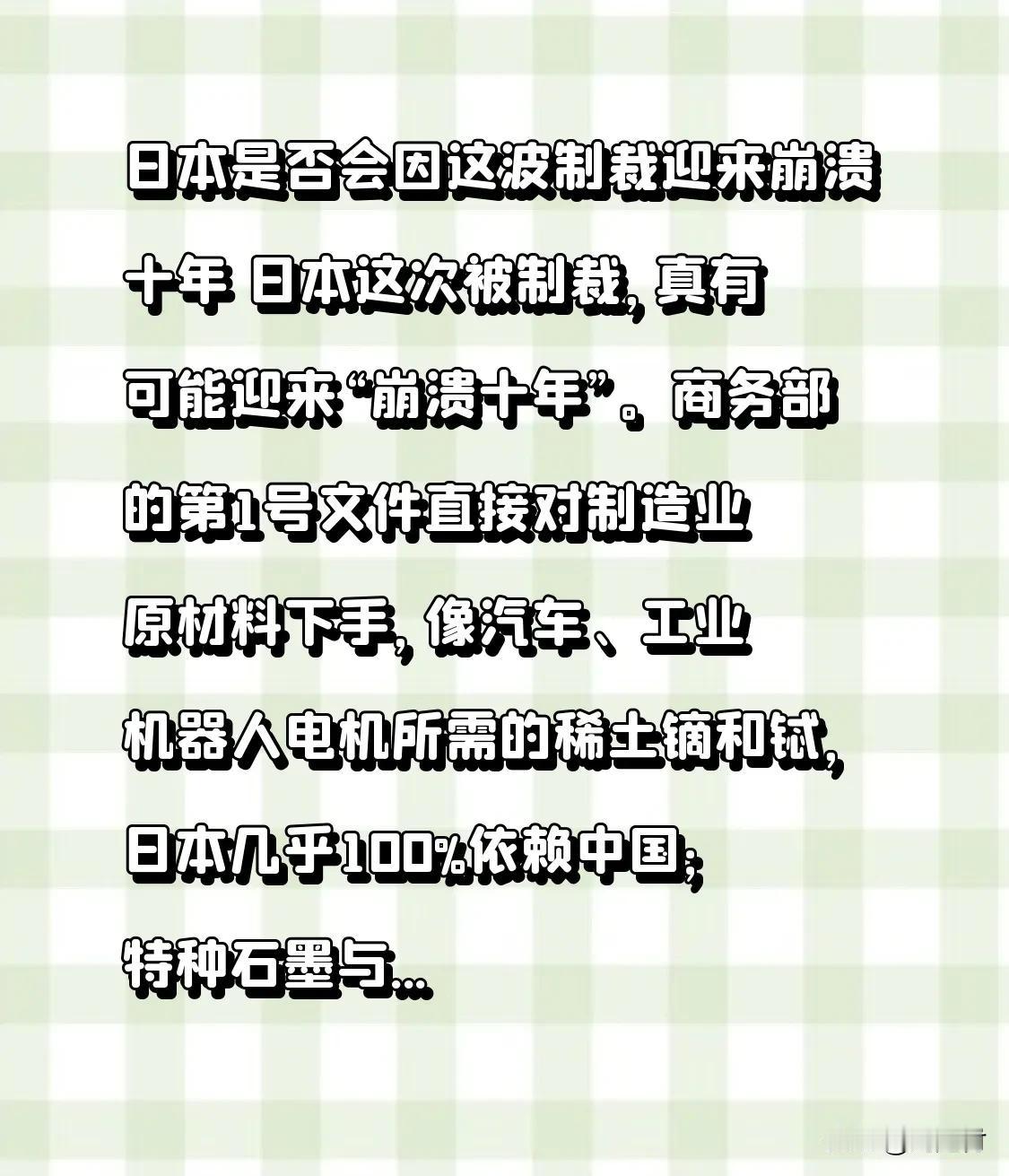 日本是否会因这波制裁迎来崩溃十年 日本是否会因这波制裁迎来“崩溃十年”?此次被制裁,日本真有可能陷入“崩溃十年”。商务部第1号文件直指制造业原材料,汽车、工业机器人电机所需的稀土镝和铽,日本几乎100%依赖中国;特种石墨与碳基材料也长期从中国进口,且此次禁止转卖。即便日本高价购得原料,成本上升、产品价格飙升,竞争力也将大幅削弱。 第2号公告对原产于日本的进口二氯二氢硅发起反倾销立案调查,意味着中国在相关领域自主能力增强,日本产品可能被“清场”。日本经济本就疲软,若这波制裁持续,未来十年日子恐怕不好过。 中俄反制日本 日本发展困境 日本新政策 日本出口下降