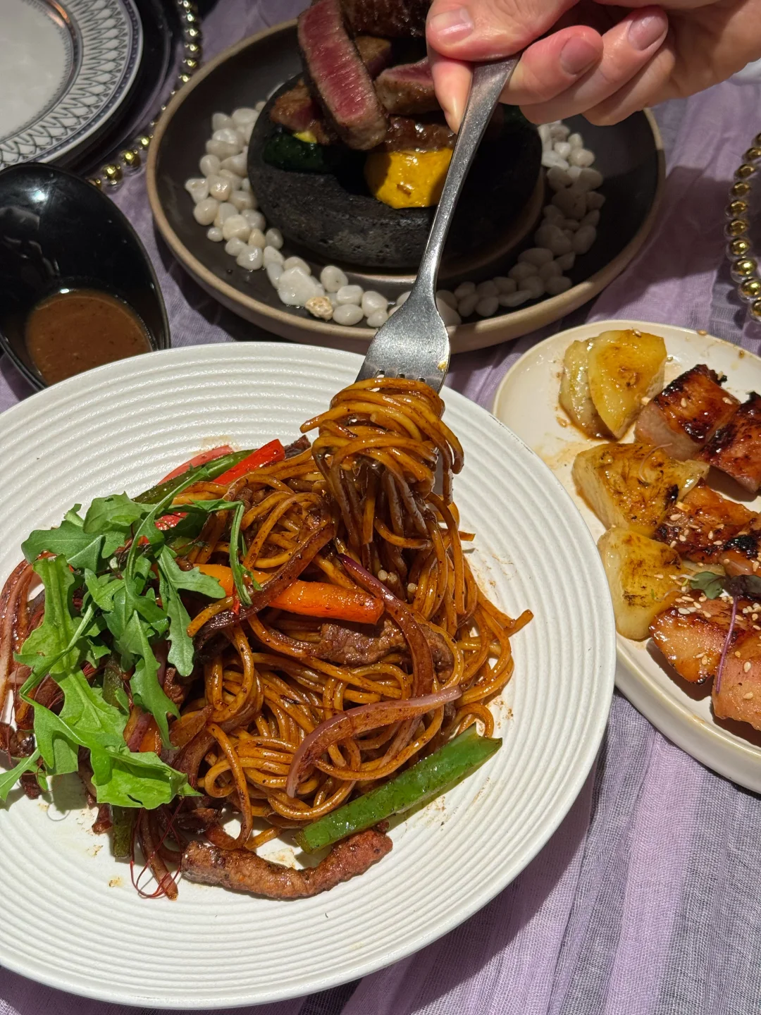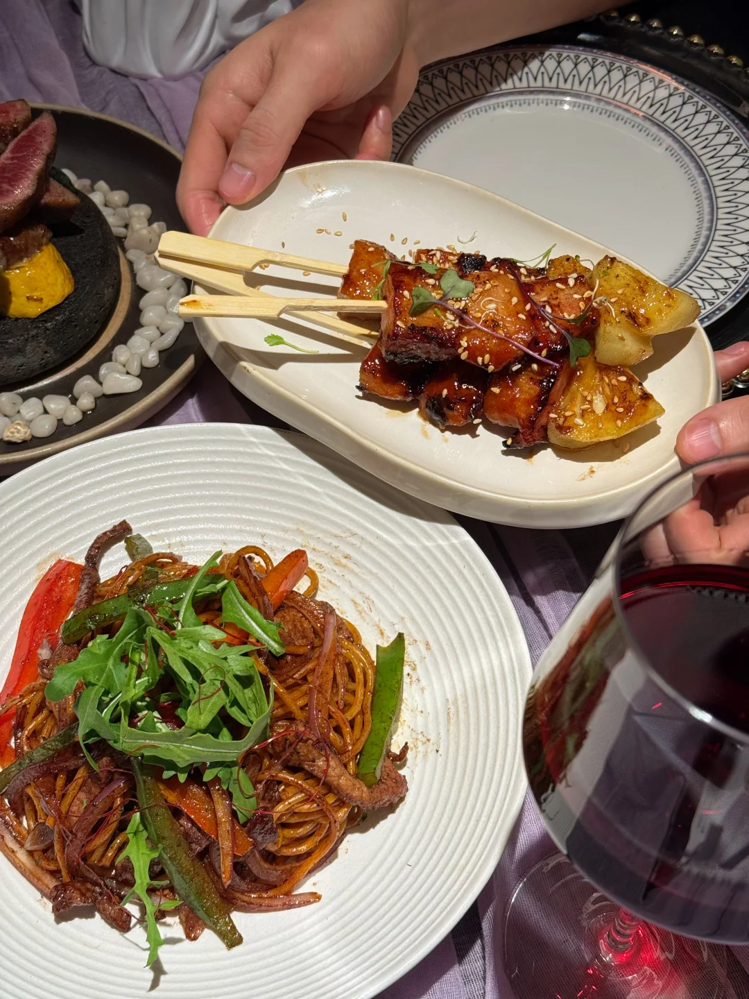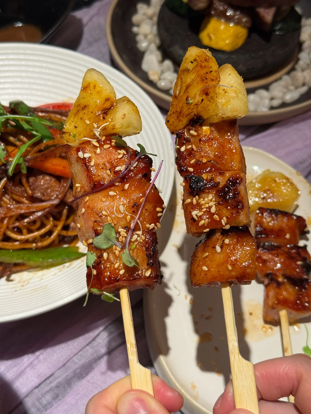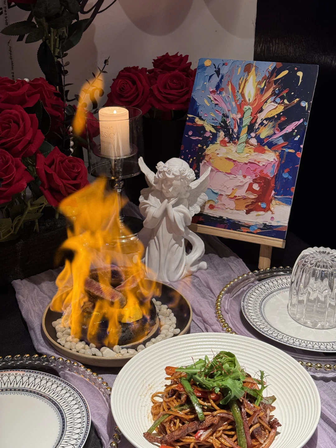 朋友太会选了吧!生日直接预定了这家 满桌的生日场景布置🎂 玫瑰花➕蜡烛➕气球➕kt板➕生日画 很适合过生日🎂,约会聚餐💕 环境布置的很不错,适合打卡拍照📷 整个氛围感满满的哇💯 店内一直播放轻音乐🎵听着很舒服~ 菜品选择蛮多的,摆盘也很漂亮用心 选了火山石澳洲牛扒🥩 直接在桌上点🔥好漂亮哇 五分熟,肉质很嫩,很香,汁水丰富 好爱这个酱烤猪颈肉 菠萝搭配猪颈肉,咸甜口感👍🏼