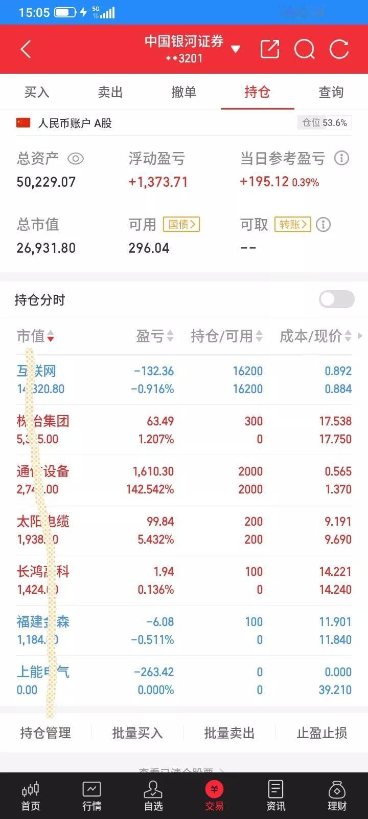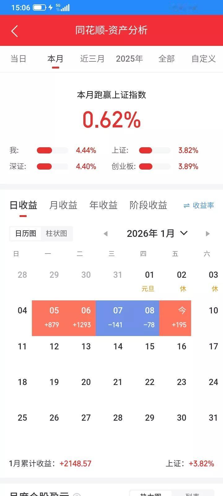 2026.01.09,今天上证指数大涨,都拉冒烟了,但是有人欢喜有人愁,我就是忧愁的一员,持有的4只股票,4只都下跌,看大家吃肉,我汤都没有喝上一口,还亏了不少,还好还有2只etf顺势上涨,把今天亏损填平了。昨天晚上感觉我的交易系统,只是尾盘交易,等于浪费了太多的时间,修改一下,开盘也交易,增加一点风险,也增加一点机会。还是红进绿出,也应用到开盘。 早上开盘,按照交易计划,开盘以11.87买入100股金森,但是反弹一点点又继续下跌了,收盘拉起来一点,收盘还是阴线,收盘以11.84卖掉昨天买入的500股,亏了十多块钱,今天买入的100股,星期一开盘卖掉。 早上以14.26买入100股长鸿,继续下跌,再创新低,下午两笔大单又拉起来,但是收盘还是收阴线,按照计划,收盘以14.24卖掉昨天买入的400股,今天买入的星期一开盘卖掉,错了及时止损认错,又亏了几块钱。 今天上能高开高走,看起来非常强势,最高冲到40.77元,再创近期新高,可能是拉高诱多,很快就逐步下跌了,下跌还心存幻想,最低跌到39.90然后触底反弹,收盘是阴线,按照计划,收盘以39.21清仓卖掉200股。持有将近2个月了,从最多亏损1600多到今天离场,还亏了263元。星期一上涨再买回来吧。下跌就等一等。 太阳今天低开反弹,冲高回落,但是收盘还是假阳线,假阳线也是阳线,再持有一天看看吧,星期一下跌再卖。 昨天阴线卖掉的株冶,今天高开高走,再创新高,最高冲到18.10,昨天收阴线,原来是洗盘,成功的把我洗出来了,早上看到高开,就没有按照计划了,灵活一点,迅速以17.11买入100股,收盘是阳线,按照计划应该是买入,就以17.75元,高价买回来200股,昨天17.05和16.90卖掉,今天又高价买回来,成本高了八九毛,但是早上买入100股,也浮盈几十块钱,不管了,忘记成本,按照交易系统操作,星期一下跌再卖掉,上涨就继续持有。 今天通信设备etf,低开继续上涨,收盘收在最高价,又是阳线,继续持有,一直阳线就一直持有。 互联网etf今天大幅高开,怕错过了大涨,放弃了交易计划,开盘急忙以0.879买入1000股,买入之后继续上涨,再回落中以0.879又买入3000股,买入之后不断上涨,最高冲到0.889,但是没有来得及高兴几分钟就逐步下跌了,最低跌到0.875,又买贵了,但是忽略盘中波动,下跌也不卖,上涨也不卖,收盘收阳线,应该补仓4000股,已经提前买入了,网格交易,应该卖出1400股,收盘以0.884卖掉1400股,按照计划做,盈亏就交给天意吧。 今天股票下跌,但是etf上涨,从最高赚几百块,再下跌中又亏几百块,都是浮盈浮亏,收盘才是真实的。今天总市值2.69万元,总资产5.02万元,今天总体账户反弹回本195元。严重跑输上证指数 。不去羡慕别人了,看好自己的一亩三分地,经营好自己的股票。红一点总比亏钱吧。
