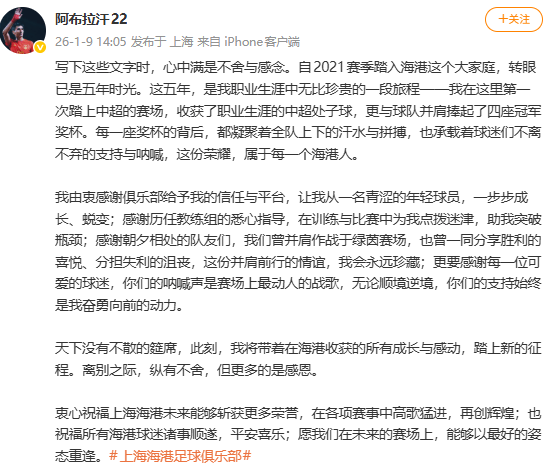 虎扑01月09日讯上海海港球员阿布拉汗在社交平台发文告别球队。有消息表示,他有望回归老东家河南队。