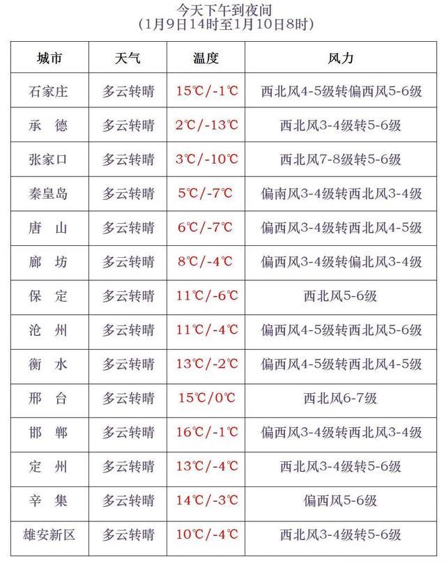 河北省气象台2026年1月9日11时发布天气预报: