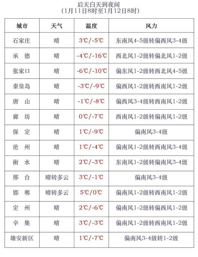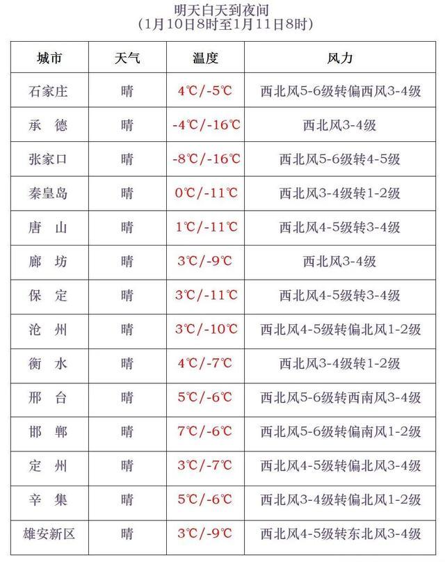10-11日早晨,张家口、承德、保定西北部和石家庄西部最低气温持续下降7~10℃,其中坝上地区下降10~12℃,其他地区下降5~7℃。11日早晨,张家口、承德最低气温降至-25~-15℃,其中坝上地区降至-30~-26℃,其他地区降至-14~-4℃。