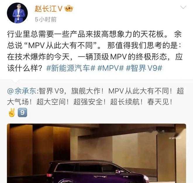 在其登上工信部之后,华为常务董事,终端BG董事长余承东也随即在社交媒体发文,提到了智界V9“春天见”,而且值得一提的是,原比亚迪腾势事业部总经理赵长江还转发了这条消息,此前就有传闻称,从比亚迪离职后加入了智界汽车担任营销负责人。