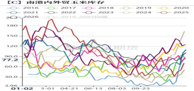 基于前期执行合同持续兑现,北粮持续南运,在销区备货情绪一般的情况下,12月以来南方港口库存环比持续增加,截止到2026年1月2日,广东内贸玉米库存47万吨,周度环比8.2万吨,同比减少75.61%,外贸库存29.4万吨,周度环比增加3万吨,因南方库存逐步增加,供应偏紧程度缓解,因此12月中旬以来,玉米现货价格回调幅度大于北方港口,南北港口利润倒挂。