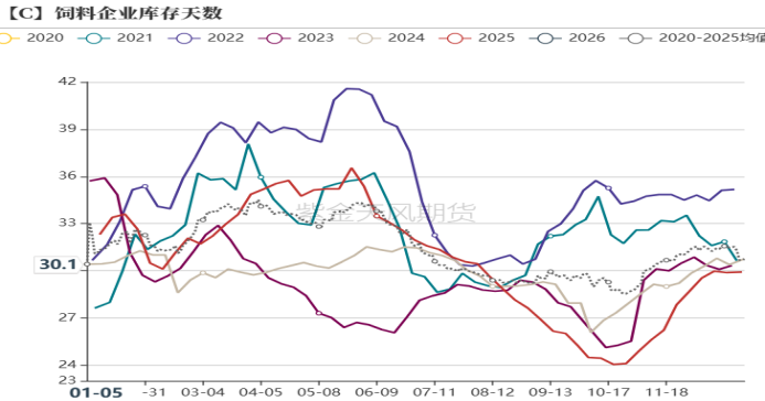 进入1月,鸡蛋以及生猪等畜禽产品现货价格震荡反弹,市场悲观情绪有所缓解,补栏情绪以及信心有所回暖,仔猪以及鸡苗价格企稳反弹,因此在冬季没有疫情较大程度干扰下,饲料需求在今年整体依然保持强劲。但生猪以及鸡蛋鸡蛋的养殖利润现阶段处在盈亏边缘或者微盈阶段,在经过2025年下半年的亏损,养殖端现金流相对较为紧张,饲料原料更多保持安全库存为主,或者锁定远期价格,建立虚拟库存为主,因此12月中旬以来,饲料企业基本维持30天库存左右。