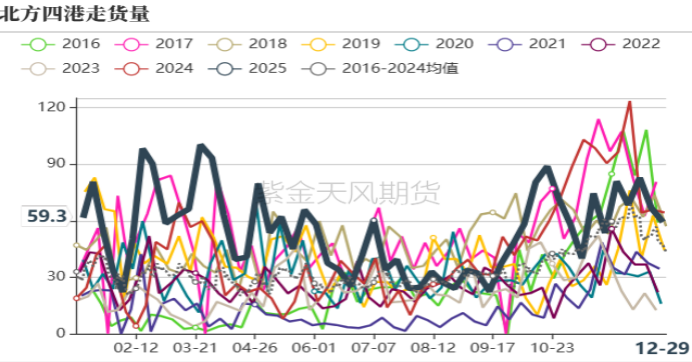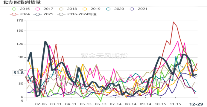12月中旬因受东北雨雪天气影响,玉米到港量下降,月底中下游企业因节日有备货需求,再度提价收购,到港量触底反弹,本周集港量继续逐步回升。12月中旬以来因执行前期订单,北方港口发运需求维持相对高位,港口库存整体呈现下降趋势。截至12月29日,北方四港库存合计153.8万吨,周度环比下降8万吨左右,虽远低于2024年同期,但高于2023年水平。