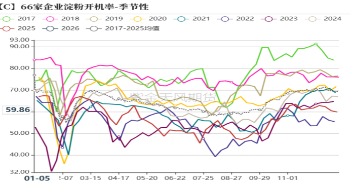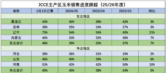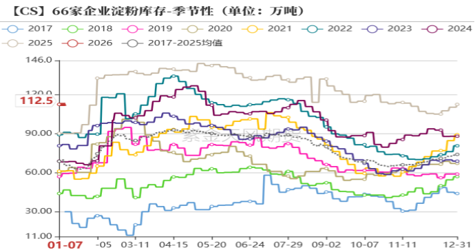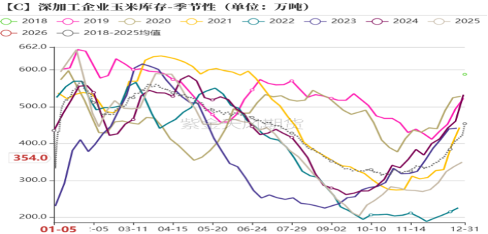 截止到12月29日,国内玉米售粮进度为47%,周度环比增加2%,同比增加2%;华北地区售粮进度为42%,环比增加2%,同比减少1%;东北地区售粮进度为46%,环比增加2%,同比增加6%,从数据上来看,2025/26年度售粮进度同比快于去年,但东北地区因今年丰产,实际销售进度并不比去年快。本年度整体售粮进度快于往年,主要是前期华北因凉嗮被迫卖粮,以及11月华北,华东去东北“抢粮”,导致中下游企业备货积极,提价收购,因此销售进度快于去年同期,但进入12月以后因现货价格坚挺,基层惜售情绪增加,加上玉米深加工企业低位补充库存完成,供需进入相持阶段,在购销都比较谨慎的情况下,12月以来售粮进度环比增幅变缓,低于往年平均水平。今年春节时间相对延后,加上基层低价惜售情绪较强,尽管年前地趴粮仍将持续上市,但市场面临的集中供应压力可能不及此前预期。