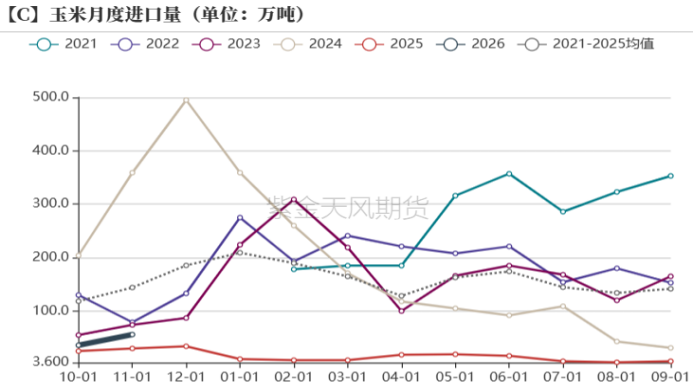 2025年11月玉米进口量55.5万吨,环比增55.5%,同比增87%。11月玉米进口量同比及环比均大幅增加,进口国主要是巴西,11月-次年1月巴西玉米到港量预期在150-200万吨之间,但这个进口量还在进口配额内,暂不对国内玉米供需产生较大影响,但目前全球玉米的供需整体呈现宽松状态,加上南美新季玉米仍以无论1%关税的巴西及阿根廷玉米,或者11%关税的美玉米进口利润都比较丰厚,若现货价格上涨超预期,或者不可控,不排除国内大幅增加国外进口。