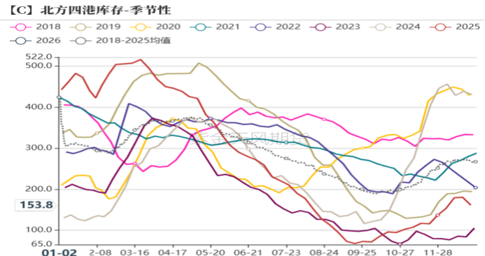 整体来看,随着春节临近,市场购销进入阶段性旺季,北方集港以及下海量或将环比继续增加,而库存整体以震荡为主,在南方港口库存逐步累积,偏紧程度缓解,加上进口玉米逐步到港,在利润倒挂的情况下,预期南方港口以及销区采购热情或将下降,但继续南北方港口同比库存偏低,加上春节前备货刚需,因此出现供应过剩的概率较小。