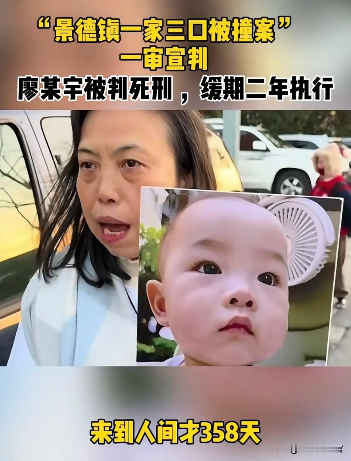 景德镇一家三口被撞案肇事者被判死缓 1月9日,景德镇一家三口被撞案一审宣判,肇事司机廖某宇被判死缓。2024年10月2日晚高峰,廖某宇开车与孙某某争执后加速行驶,撞向过马路的一家三口,致三人死亡。 虽说他案发后拨打急救和报警电话且现场等候,但这三条人命哪是那么轻易能弥补的。节假日晚高峰主干道,车多人多还超速,这种行为太不负责任。判死缓,有人觉得重有人觉得轻。可这一家三口就这么没了,留下的伤痛无法估量。希望这样的悲剧别再发生。