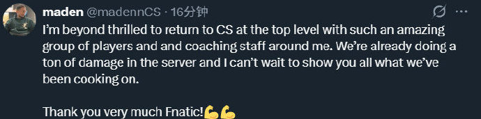 maden:“能回到顶级《反恐精英》赛场,身边还有这么出色的队友和教练组,我真的激动到不行。我们在训练赛里已经打出了超强的压制力,等不及要让大家看看我们偷偷准备的‘大招’了。太感谢Fnatic了!