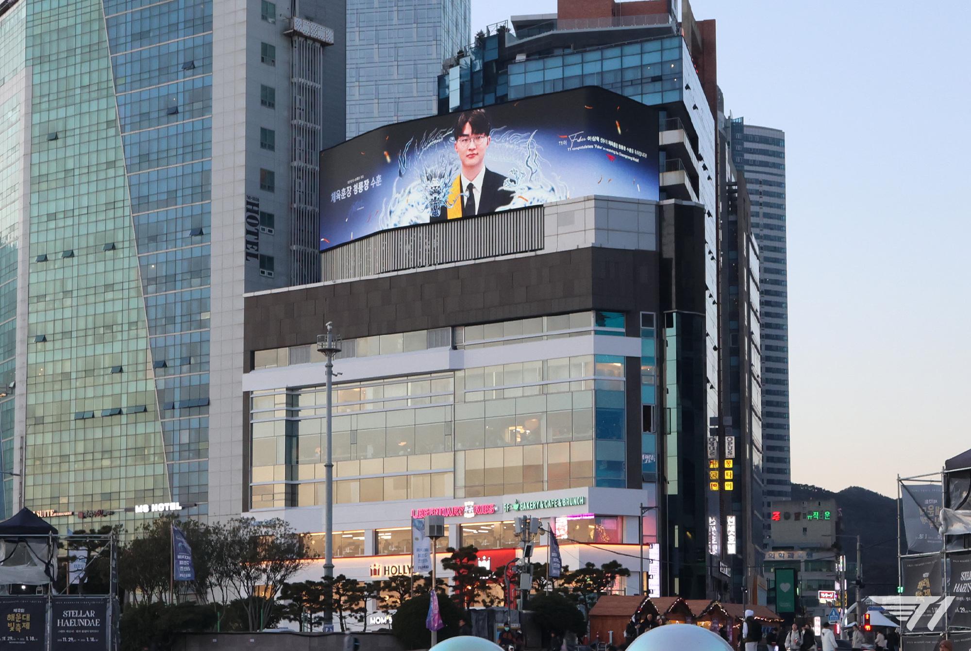 在首尔各地,都可以看到祝贺Faker选手荣获青龙章的户外大屏了!