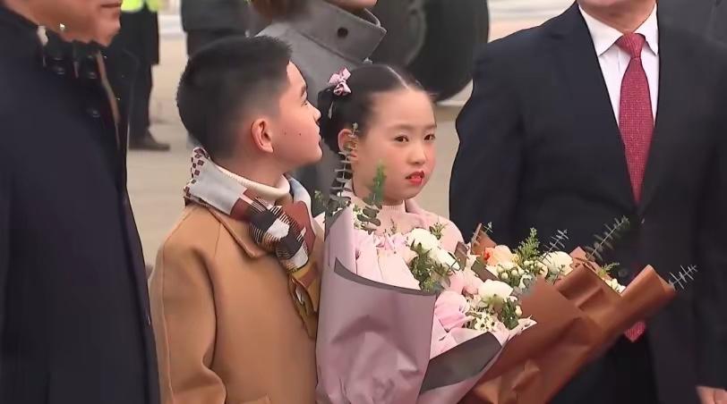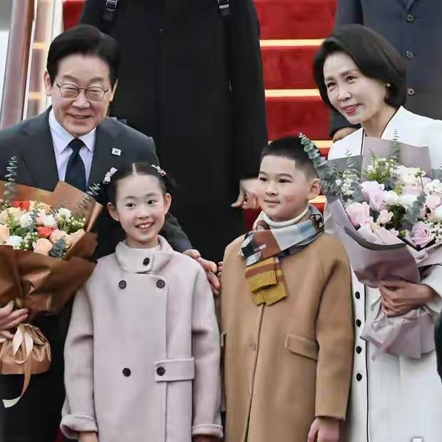 给李在明献花的两位小朋友,真好看!一个穿浅粉色大衣扎双丸子头,眉眼弯弯;一个驼色大衣配小平头,虎头虎脑,两张圆嘟嘟的小脸上,笑容自信灿烂萌翻了,咋感觉就像年画娃娃从画中走出来一般,太过喜庆可爱又养眼~ 合照中,金惠景一袭黑白配无领大衣,虽简约却与她温婉端庄的气质太适配了!夫妇俩手捧鲜花对镜甜笑,与两位“年画娃娃”的萌态相映成趣!